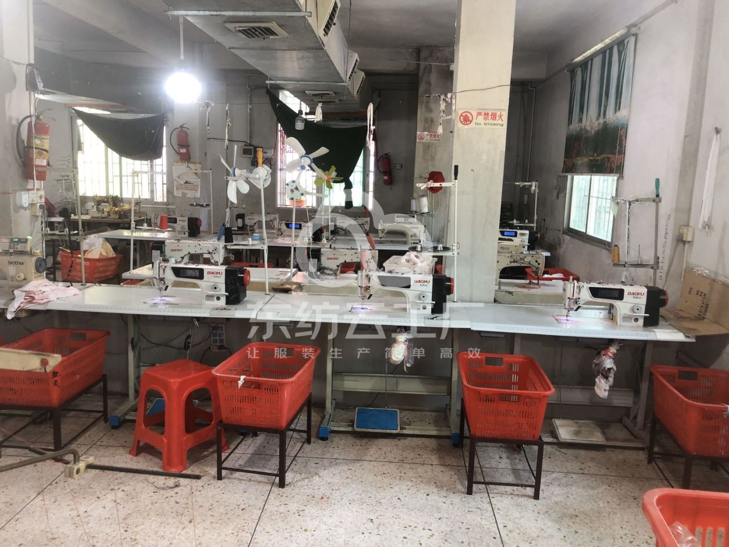 验布机:1台,断布机:2台,自动打扣机:2台,平车:30台,电烫炉:1台,打边机:8台,双针车:2台,电剪:3台,烫台:3台,锅炉:1台,水空调:2台,裁床:2台
