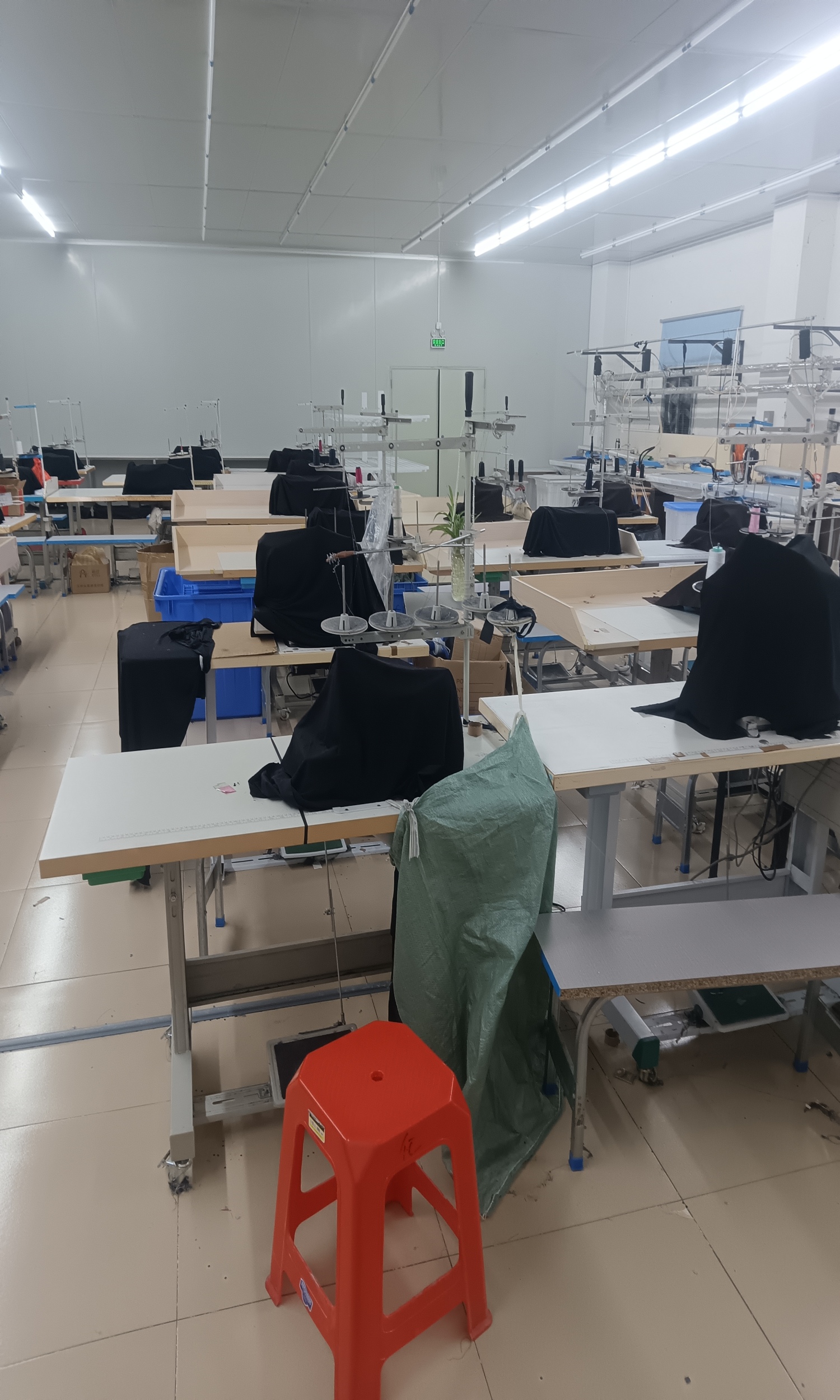 裤头车:2台,自动拉布机:1台,断布机:2台,钉扣:1台,自动打扣机:1台,平车:40台,电烫炉:4台,针扣机:1台,打边机:12台,双针车:1台,电剪:3台,烫台:4台,冚车:5台,唛架机:1台,锅炉:2台,裁床:1台,四线:10台