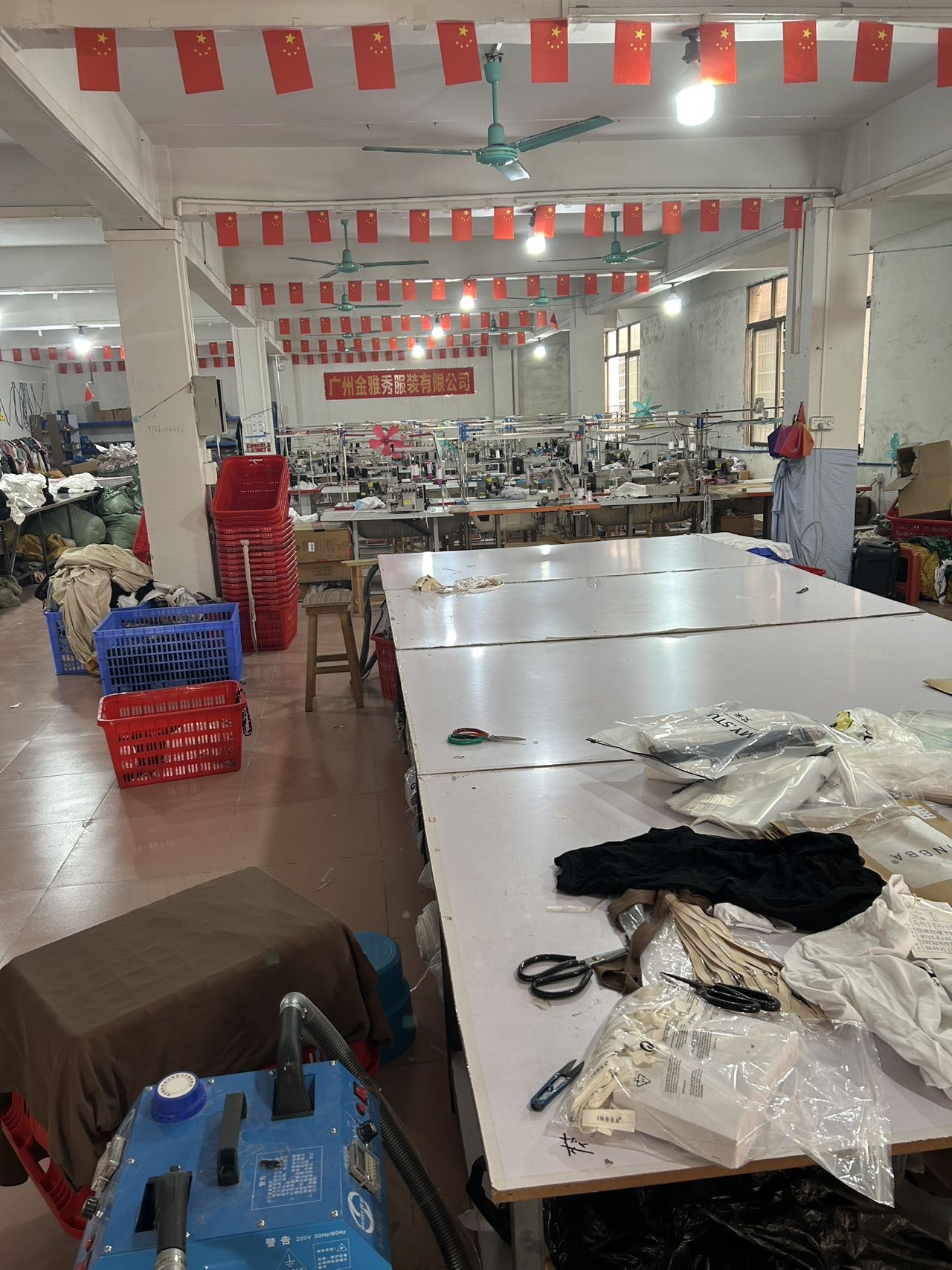 剪线机:1台,吊机:1台,平车:5台,电剪:2台,烫台:1台,冚车:4台,唛架机:1台,锅炉:1台,水空调:2台,裁床:1台,五线:2台,四线:10台