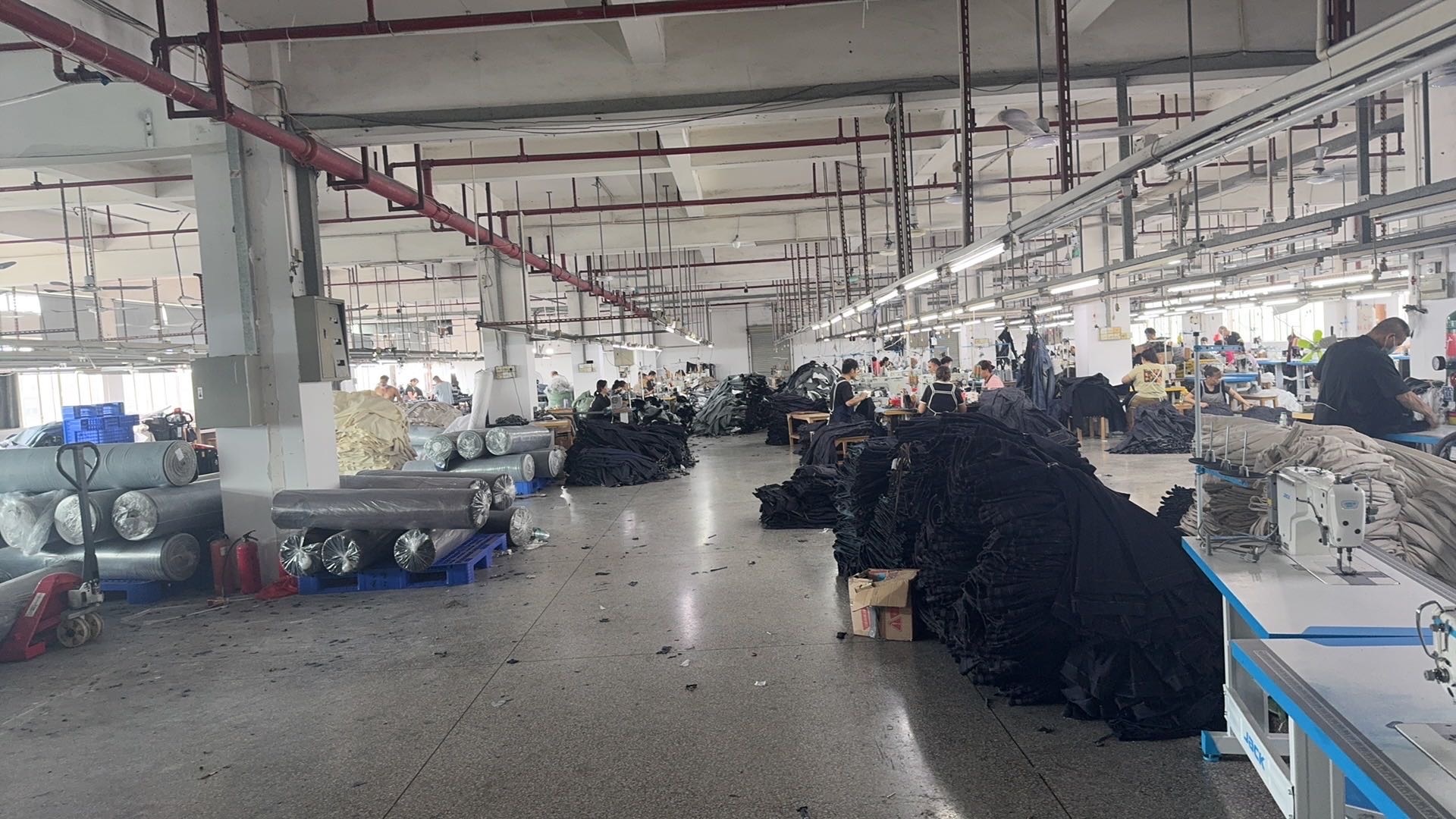 裤头车:5台,智能模板机:1台,自动拉布机:0台,电脑自动裁:1台,啤机:0台,松布机:0台,定扣机:4台,挑脚机:2台,剪线机:4台,验布机:1台,断布机:2台,自动打扣机:2台,平眼:1台,平车:60台,电烫炉:4台,针扣机:1台,直眼:1台,电脑凤眼:3台,打边机:10台,双针车:15台,电剪:5台,烫台:7台,冚车:0台,唛架机:2台,锅炉:5台,水空调:0台,裁床:2台,五线:16台,四线:8台