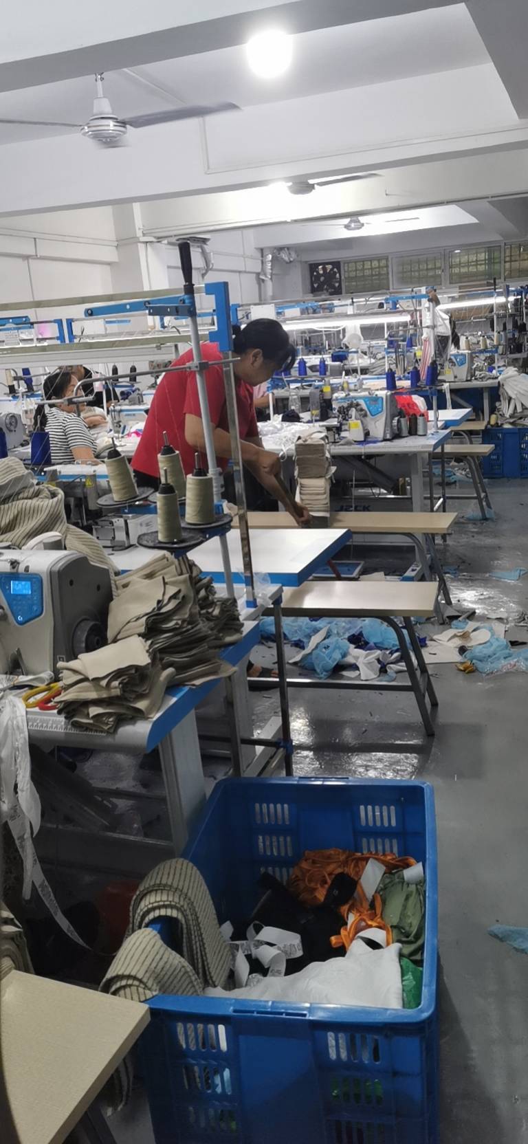 电脑自动裁:1台,剪线机:2台,平车:25台,电烫炉:4台,打边机:10台,冚车:2台,唛架机:1台,锅炉:2台,裁床:1台,五线:6台,四线:9台