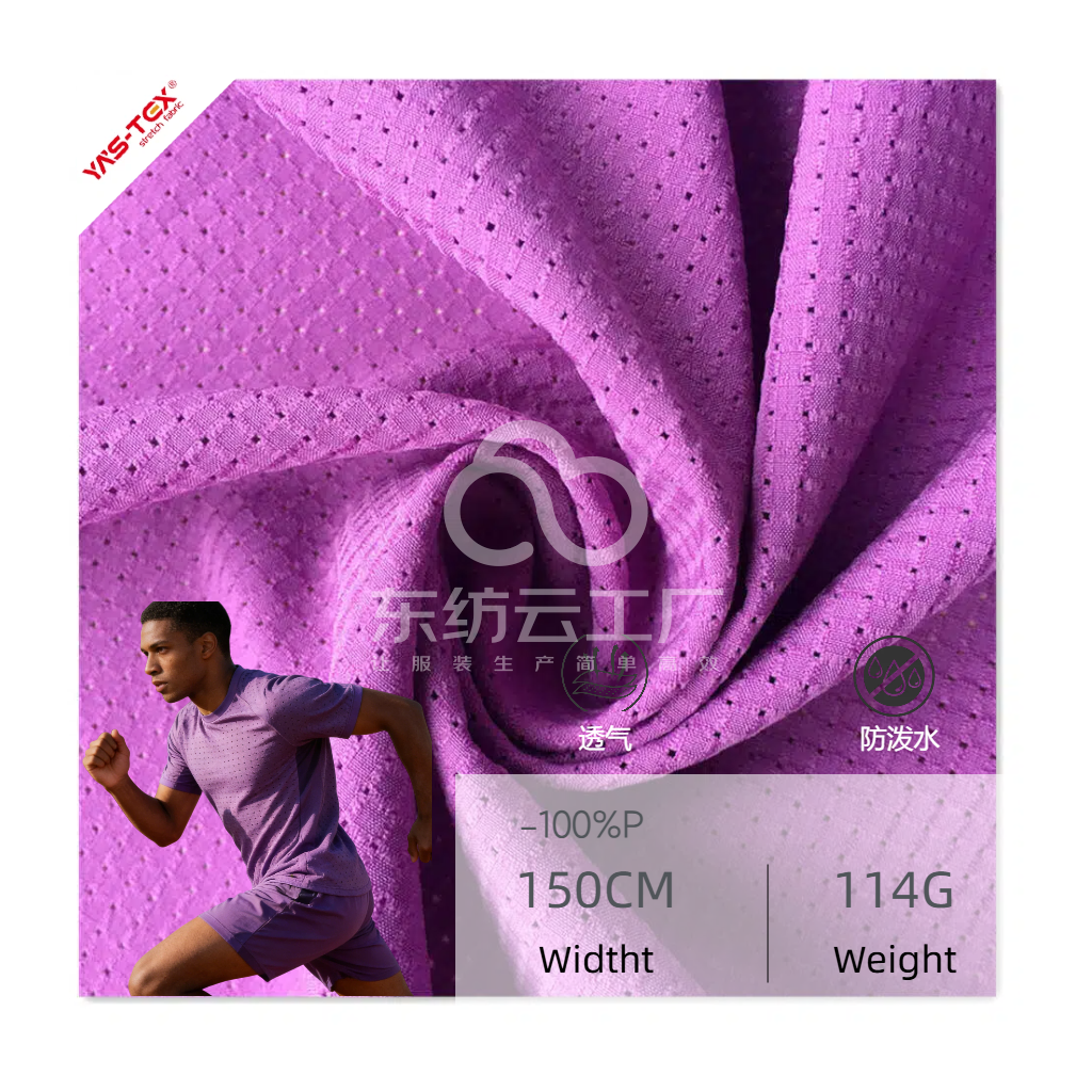 面料通过特殊的织造工艺形成格子纹理,同时在布料上有穿孔设计,这些穿孔通常是均匀分布的,赋予了面料独特的外观和性能。此外,面料还经过防泼水整理,一般是通过涂层或浸渍等工艺,在面料表面形成一层防水薄膜,使其具有防泼水功能。