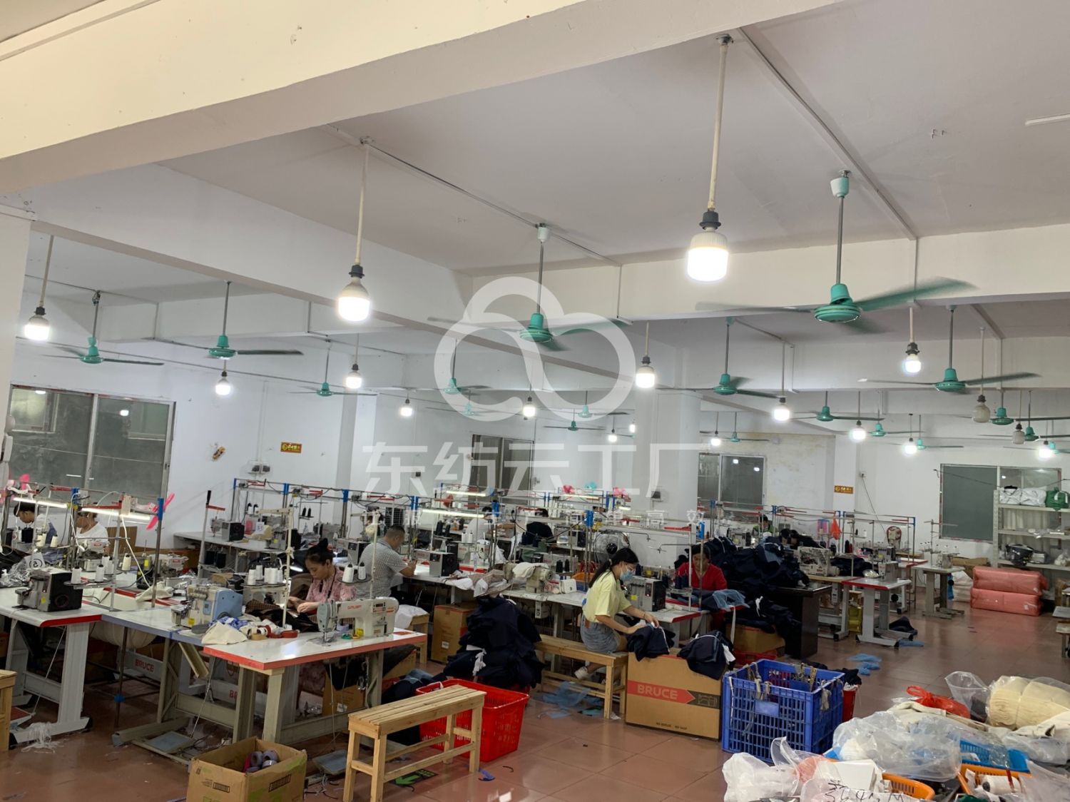 剪线机:1台,验布机:1台,断布机:1台,吊机:1台,平车:35台,电烫炉:2台,双针车:2台,电剪:2台,烫台:4台,冚车:2台,唛架机:1台,锅炉:2台,裁床:1台,五线:8台,四线:10台