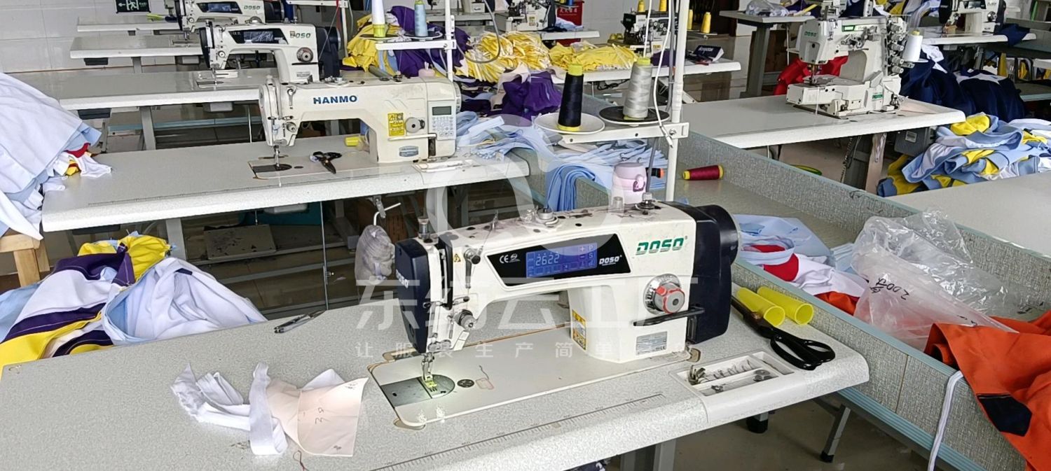 松布机:2台,定扣机:5台,剪线机:5台,断布机:2台,自动打扣机:1台,平眼:2台,平车:90台,电烫炉:2台,直眼:2台,电脑凤眼:3台,打边机:10台,双针车:6台,电剪:2台,烫台:6台,冚车:6台,唛架机:1台,锅炉:2台,裁床:2台,五线:6台,四线:8台