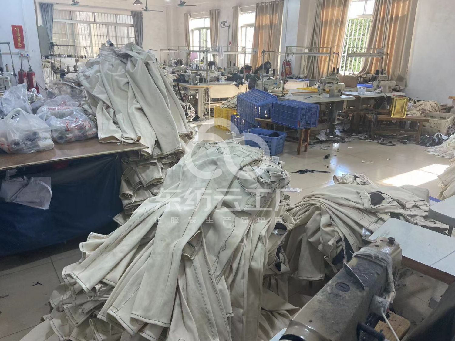 裤头车:2台,智能模板机:1台,自动拉布机:1台,电脑自动裁:2台,啤机:1台,松布机:1台,定扣机:2台,挑脚机:1台,剪线机:4台,验布机:1台,断布机:2台,钉扣:2台,自动打扣机:1台,平车:25台,电烫炉:4台,针扣机:2台,直眼:1台,电脑凤眼:1台,打边机:5台,双针车:4台,电剪:2台,烫台:4台,唛架机:1台,锅炉:1台,水空调:2台,裁床:2台,五线:3台,四线:2台