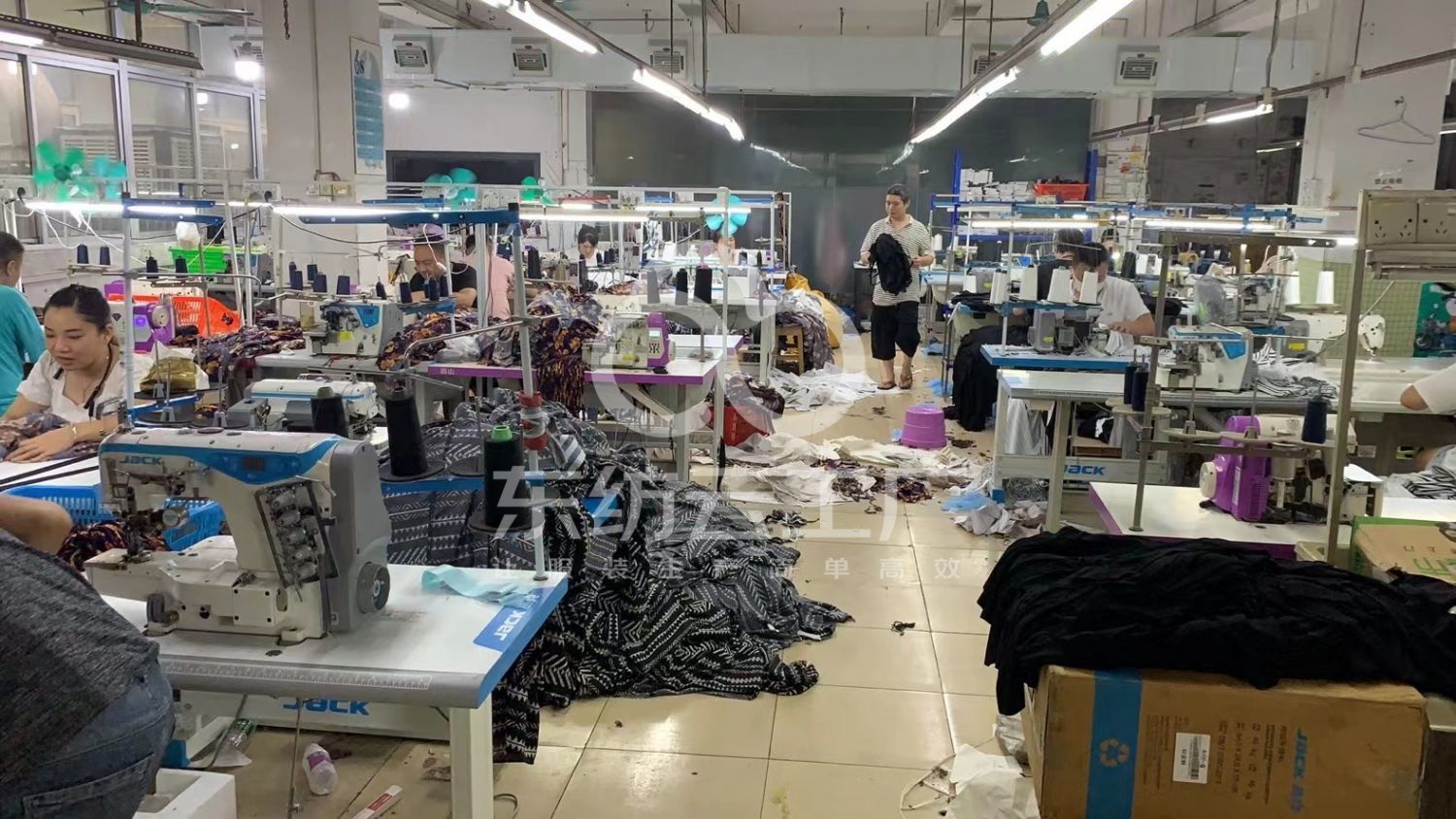 验布机:1台,断布机:2台,双针车:6台,电剪:2台,烫台:2台,冚车:5台,唛架机:1台,锅炉:2台,裁床:2台,五线:12台,四线:20台