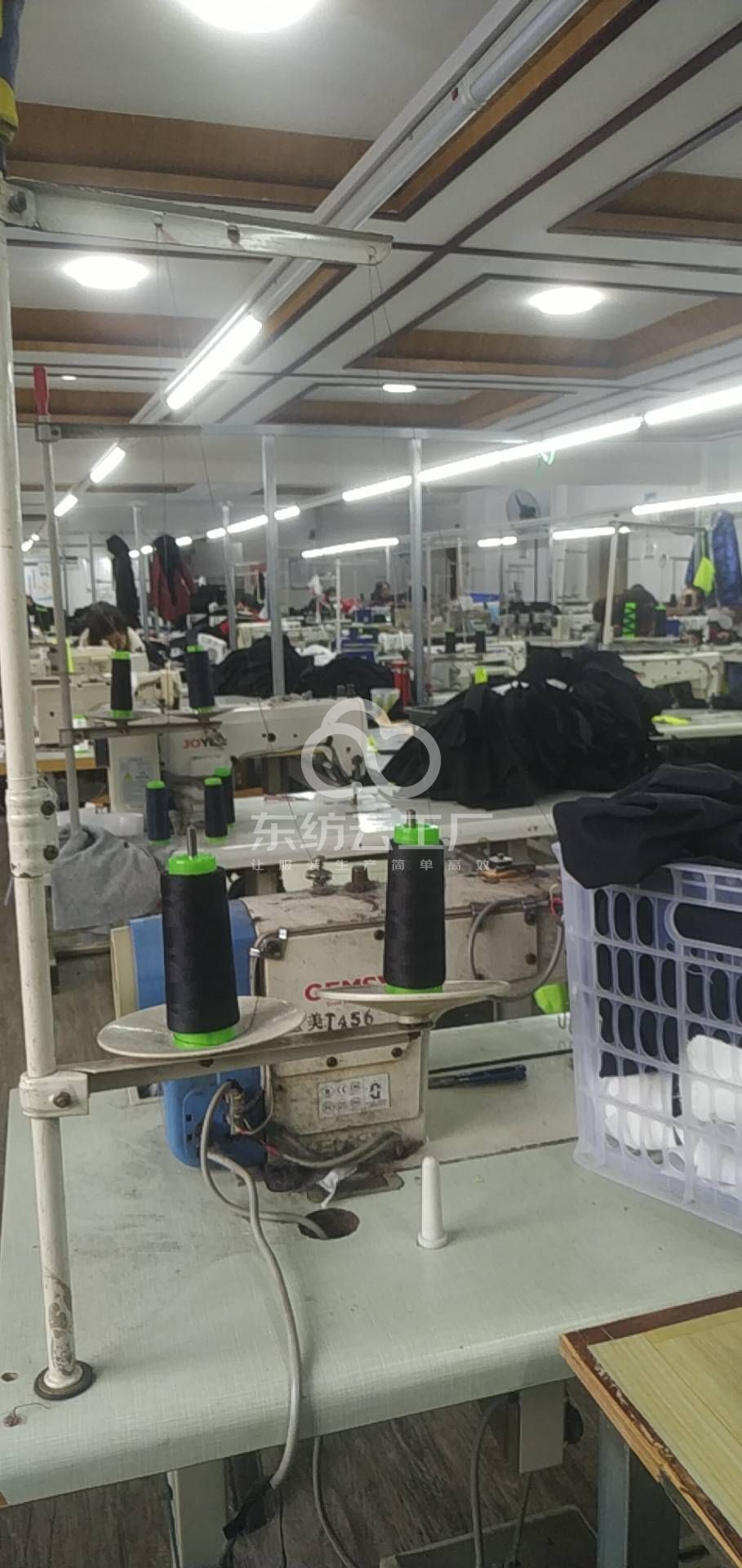 剪线机:1台,断布机:1台,钉扣:1台,自动打扣机:1台,平眼:1台,平车:68台,电烫炉:2台,针扣机:1台,直眼:1台,打边机:13台,双针车:6台,电剪:2台,烫台:3台,冚车:2台,唛架机:2台,锅炉:2台,裁床:2台,五线:6台,四线:7台