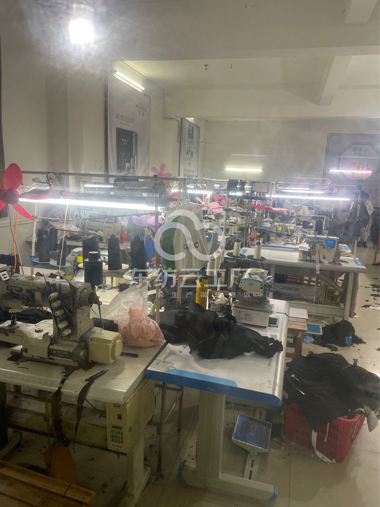 啤机:1台,松布机:1台,验布机:1台,断布机:1台,钉扣:1台,颗粒炉:1台,平眼:1台,电烫炉:2台,直眼:1台,打边机:10台,电剪:2台,烫台:2台,冚车:3台,唛架机:1台,锅炉:1台,裁床:1台,五线:5台,四线:5台