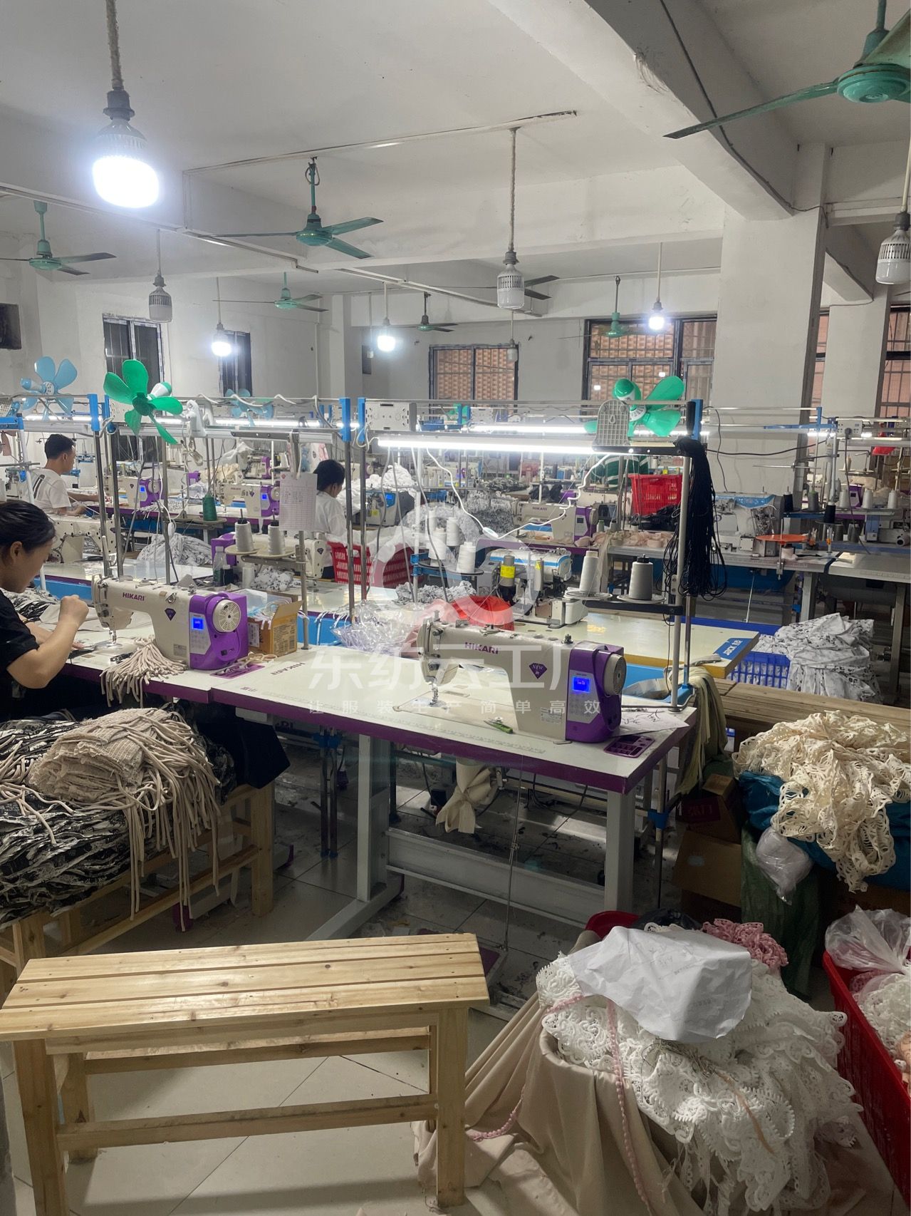 啤机:2台,剪线机:1台,断布机:1台,钉扣:1台,平车:30台,电烫炉:2台,打边机:20台,双针车:2台,电剪:2台,烫台:3台,冚车:2台,唛架机:1台,锅炉:1台,裁床:10台,五线:5台,四线:15台