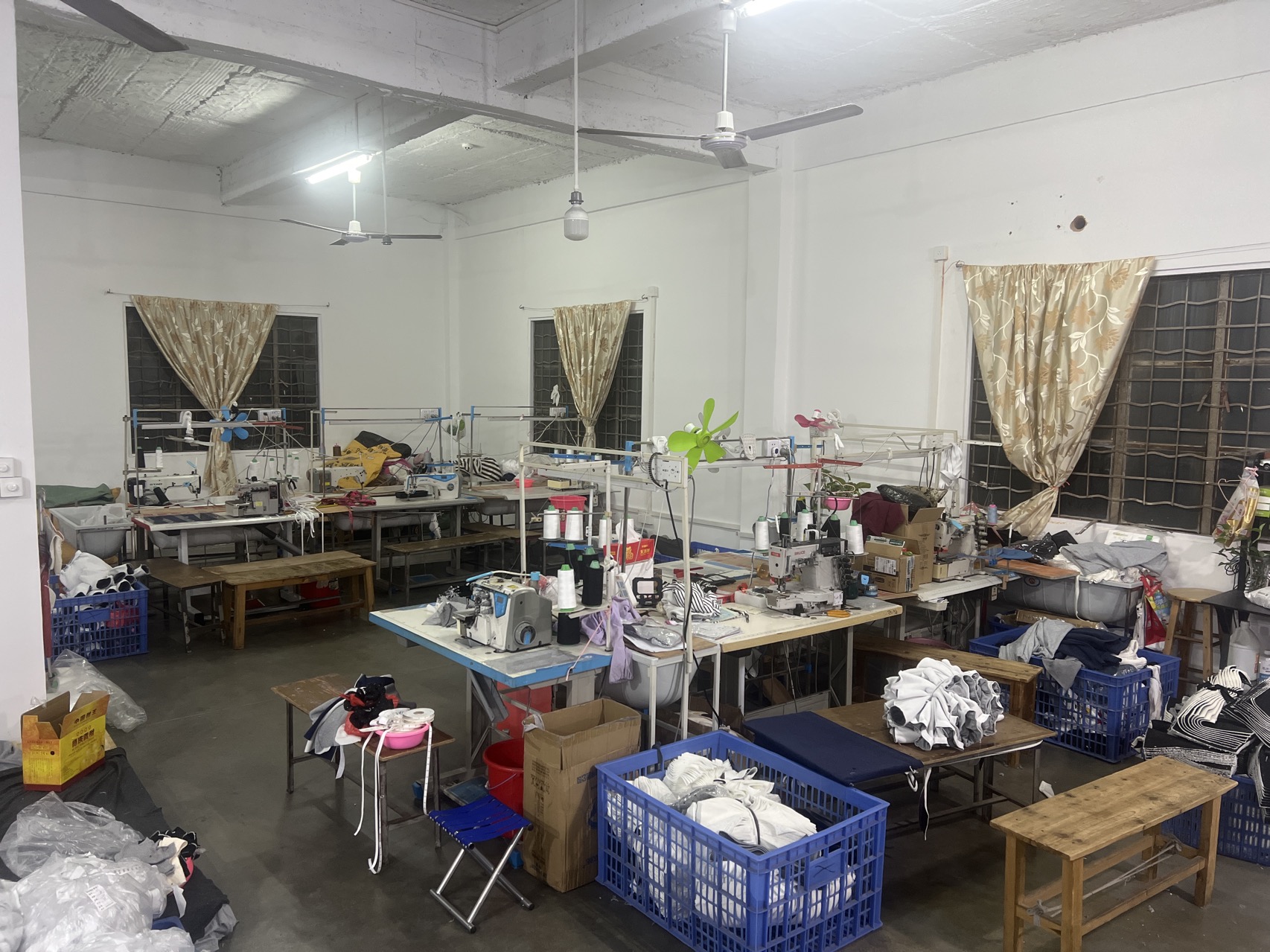剪线机:2台,平车:10台,打边机:10台,双针车:2台,电剪:4台,烫台:2台,冚车:2台,唛架机:1台,锅炉:1台,裁床:1台,五线:2台,四线:8台