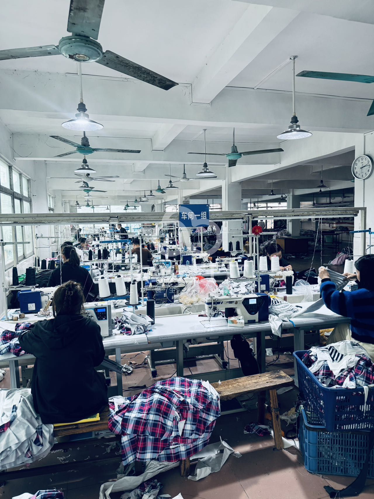 松布机:2台,剪线机:1台,断布机:2台,平车:50台,电烫炉:1台,打边机:25台,电剪:4台,烫台:8台,冚车:3台,唛架机:1台,锅炉:1台,裁床:2台,五线:10台,四线:25台