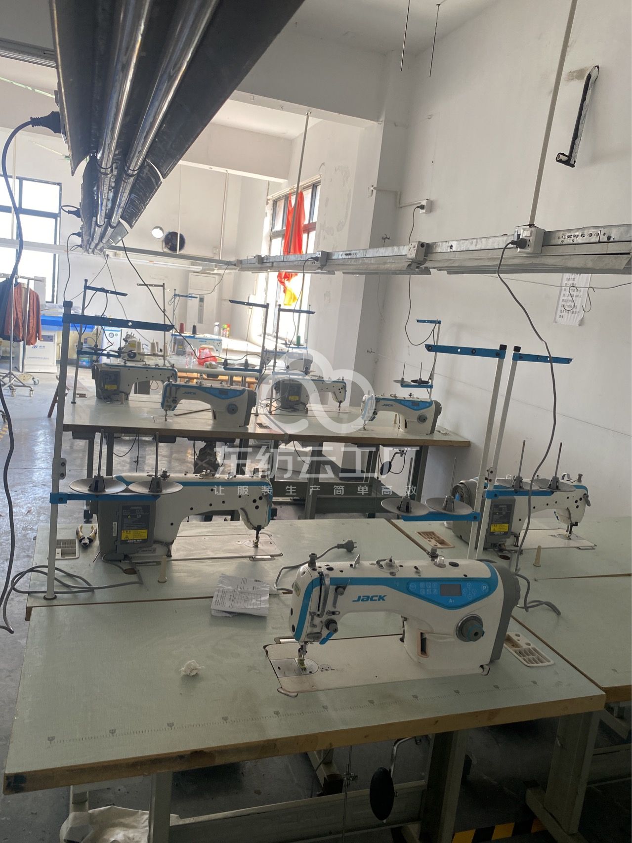 松布机:1台,定扣机:2台,验布机:1台,断布机:2台,钉扣:1台,自动打扣机:1台,平眼:2台,平车:30台,电烫炉:4台,针扣机:2台,直眼:2台,电脑凤眼:2台,打边机:10台,电剪:3台,烫台:4台,唛架机:1台,锅炉:3台,水空调:7台,裁床:1台,四线:6台