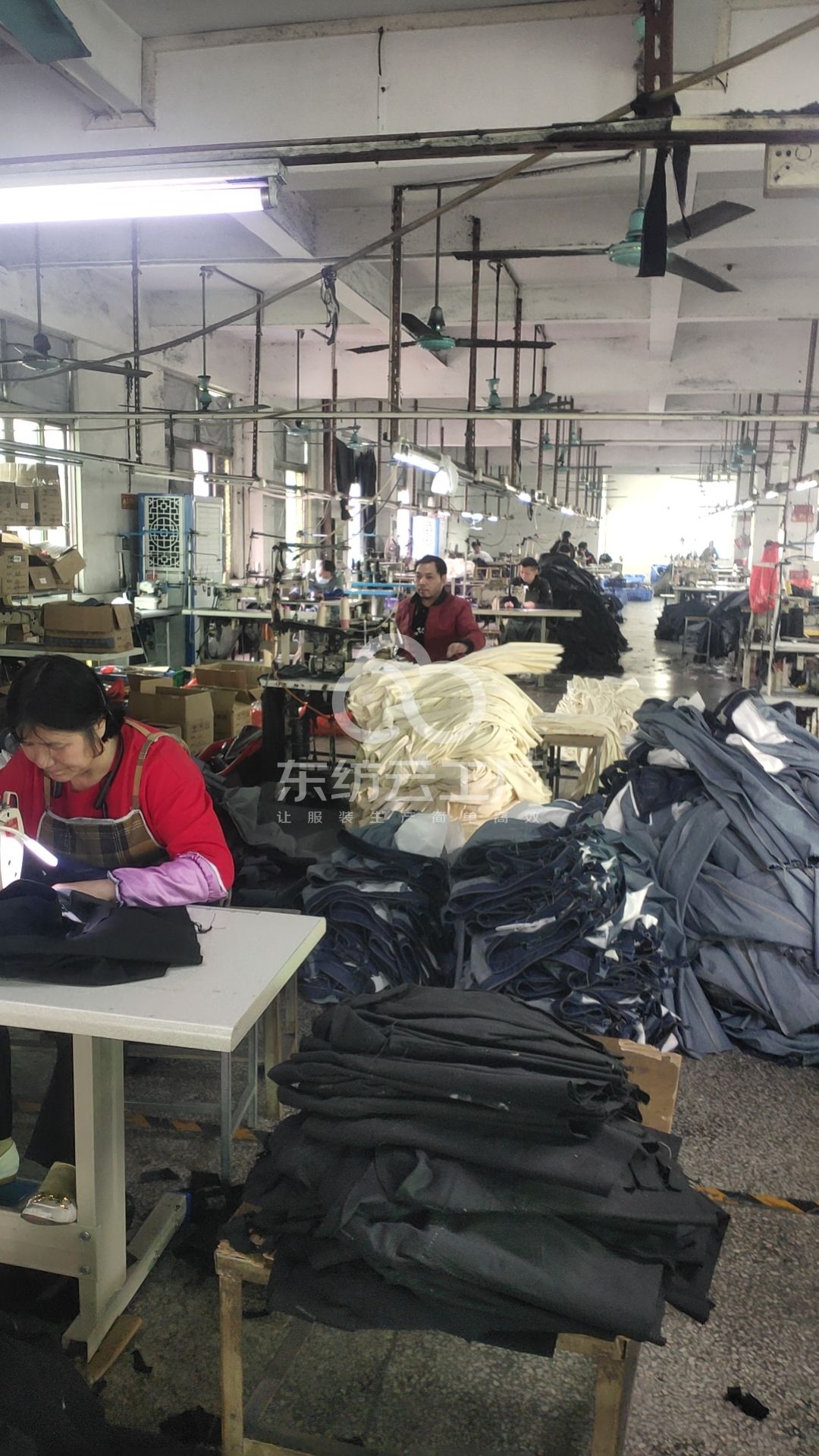 裤头车:3台,定扣机:2台,剪线机:5台,平车:32台,电烫炉:4台,针扣机:2台,电脑凤眼:3台,打边机:7台,双针车:12台,电剪:2台,烫台:4台,唛架机:1台,锅炉:1台,水空调:4台,裁床:1台,五线:5台