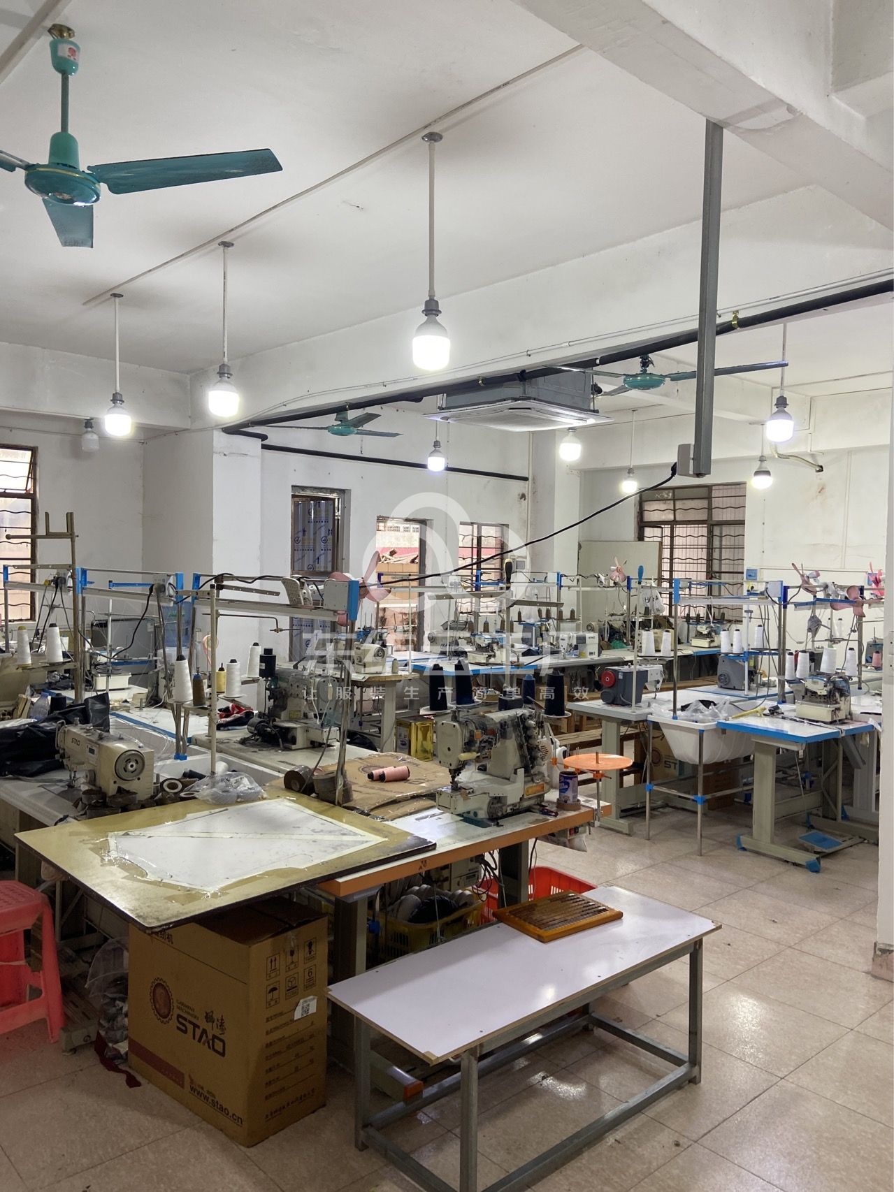电脑自动裁:1台,啤机:3台,松布机:1台,定扣机:1台,挑脚机:1台,剪线机:2台,验布机:1台,断布机:2台,钉扣:2台,自动打扣机:1台,颗粒炉:1台,平眼:1台,吊机:1台,平车:10台,电烫炉:1台,针扣机:1台,直眼:1台,打边机:12台,双针车:1台,电剪:2台,烫台:2台,冚车:2台,唛架机:1台,锅炉:1台,水空调:2台,裁床:1台,五线:2台,四线:12台