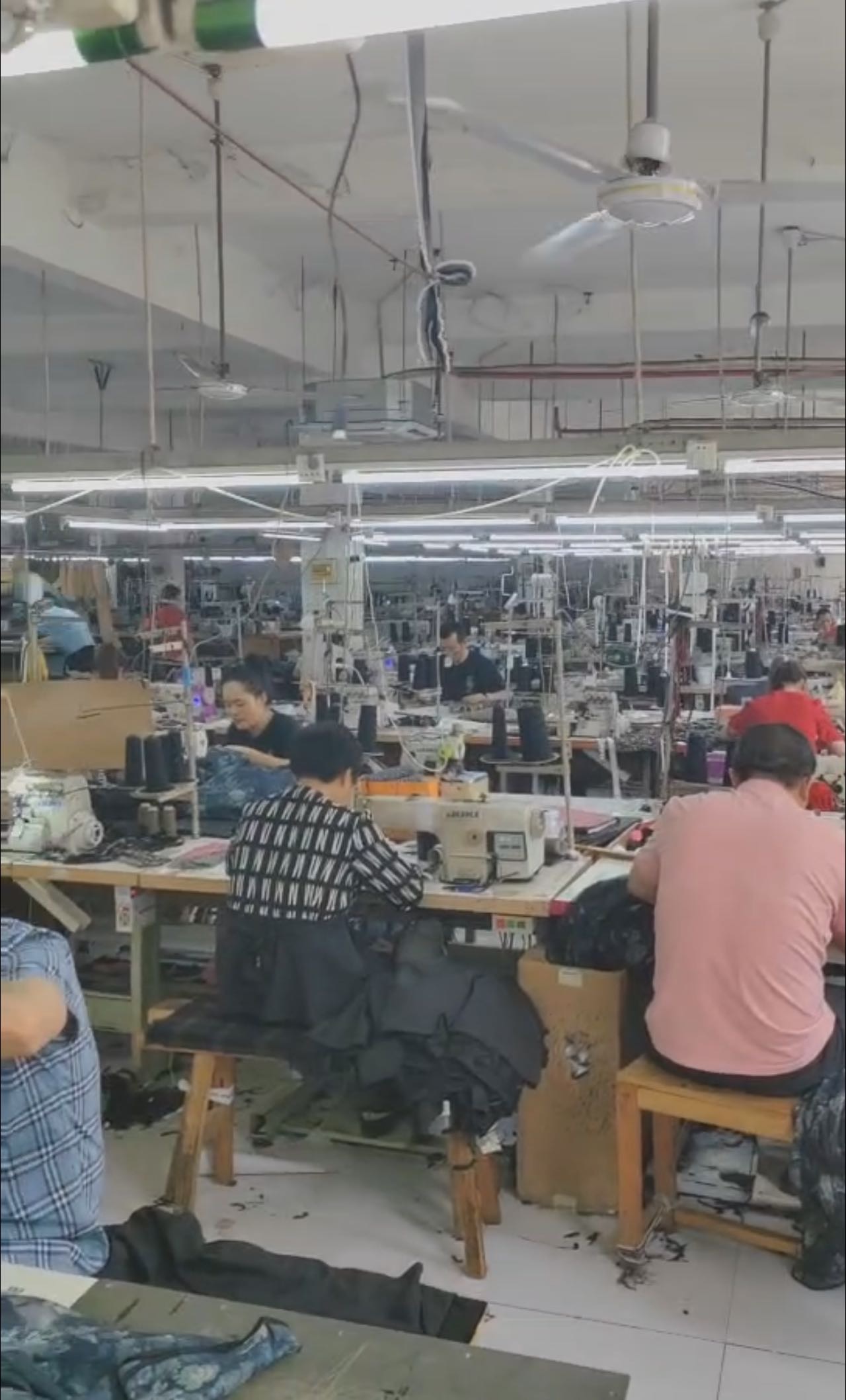 裤头车:4台,智能模板机:3台,自动拉布机:5台,断布机:8台,钉扣:8台,自动打扣机:6台,颗粒炉:3台,平车:120台,电烫炉:8台,打边机:25台,双针车:10台,电剪:8台,烫台:12台,水空调:10台,裁床:5台,五线:20台,四线:40台
