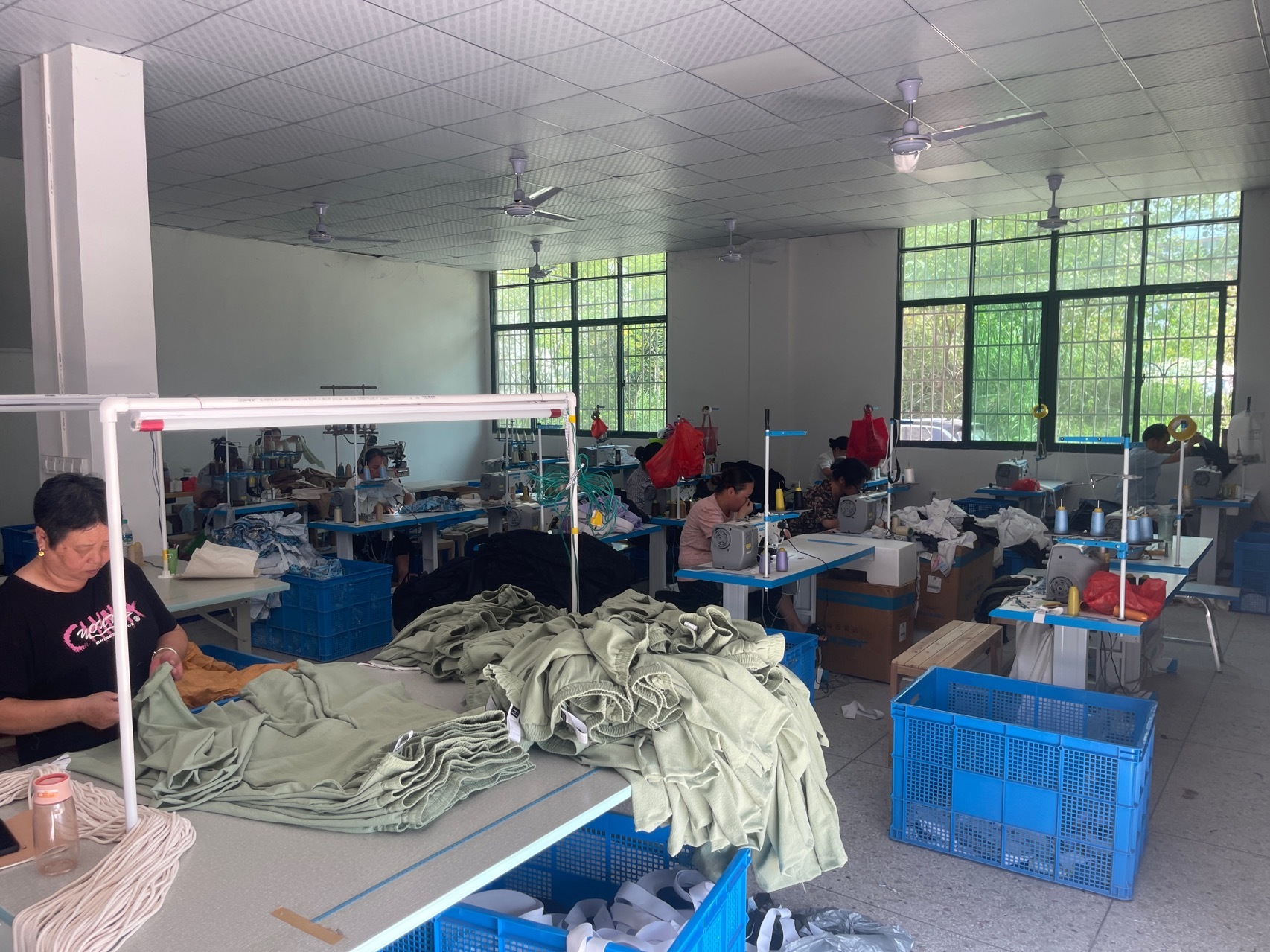 裤头车:1台,平车:12台,电烫炉:1台,双针车:1台,五线:3台,四线:1台