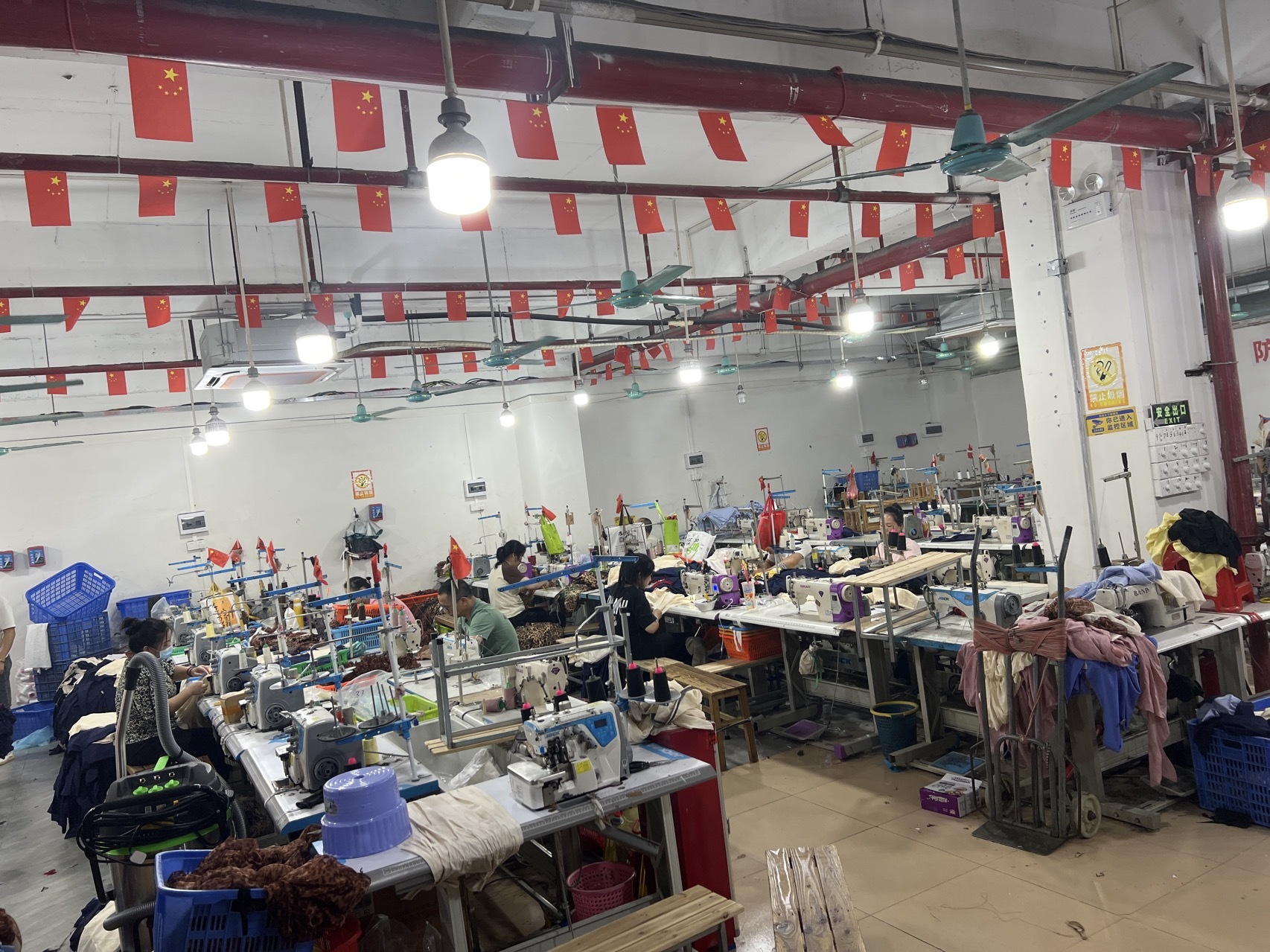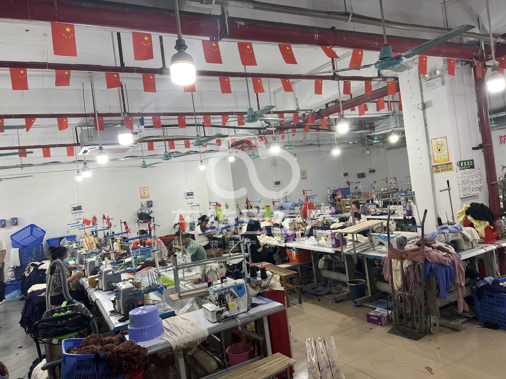 剪线机:5台,断布机:1台,平车:40台,电烫炉:3台,打边机:10台,双针车:3台,电剪:3台,烫台:3台,冚车:4台,唛架机:1台,裁床:1台,五线:7台,四线:12台
