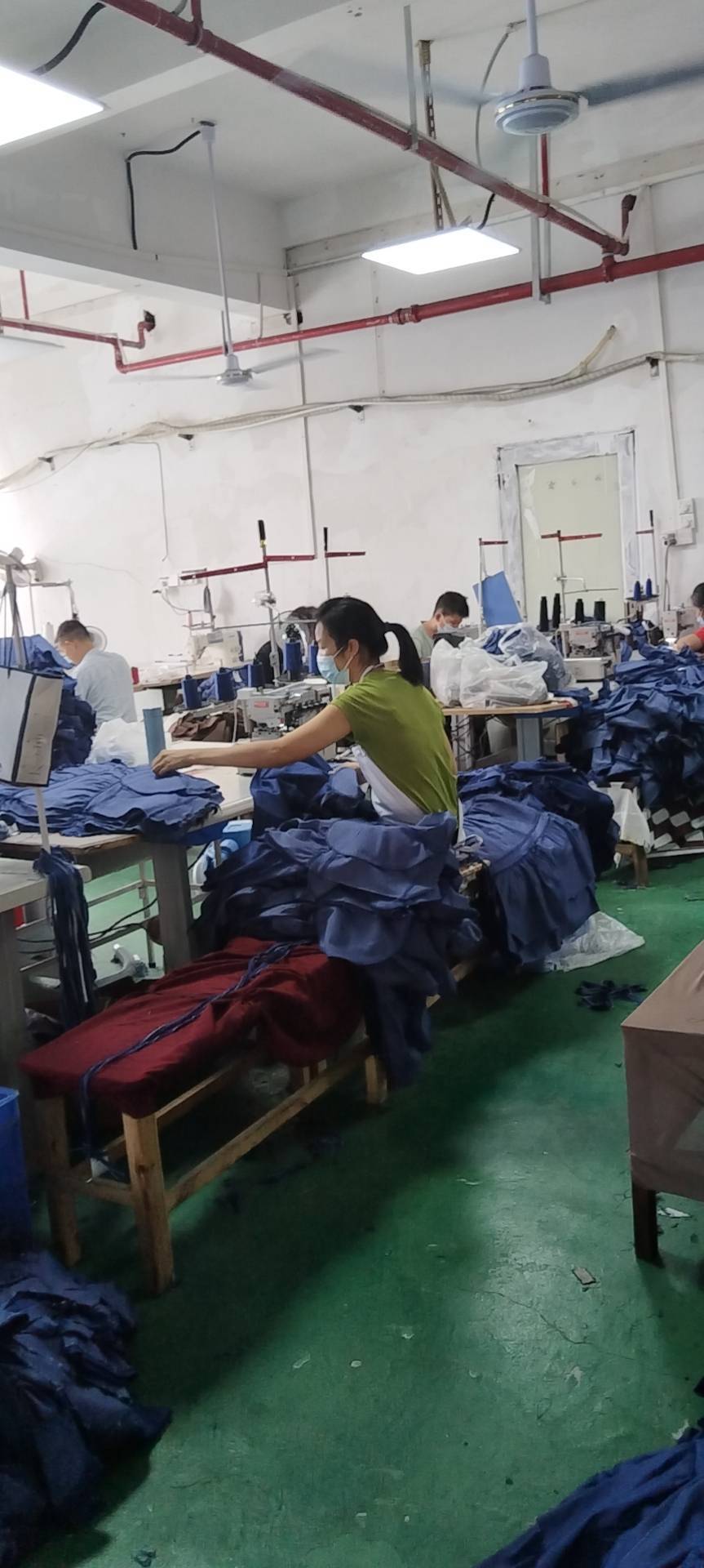 裤头车:1台,剪线机:1台,断布机:1台,平车:20台,打边机:8台,双针车:3台,电剪:2台,烫台:6台,冚车:5台,唛架机:1台,水空调:2台,裁床:1台,五线:5台,四线:6台