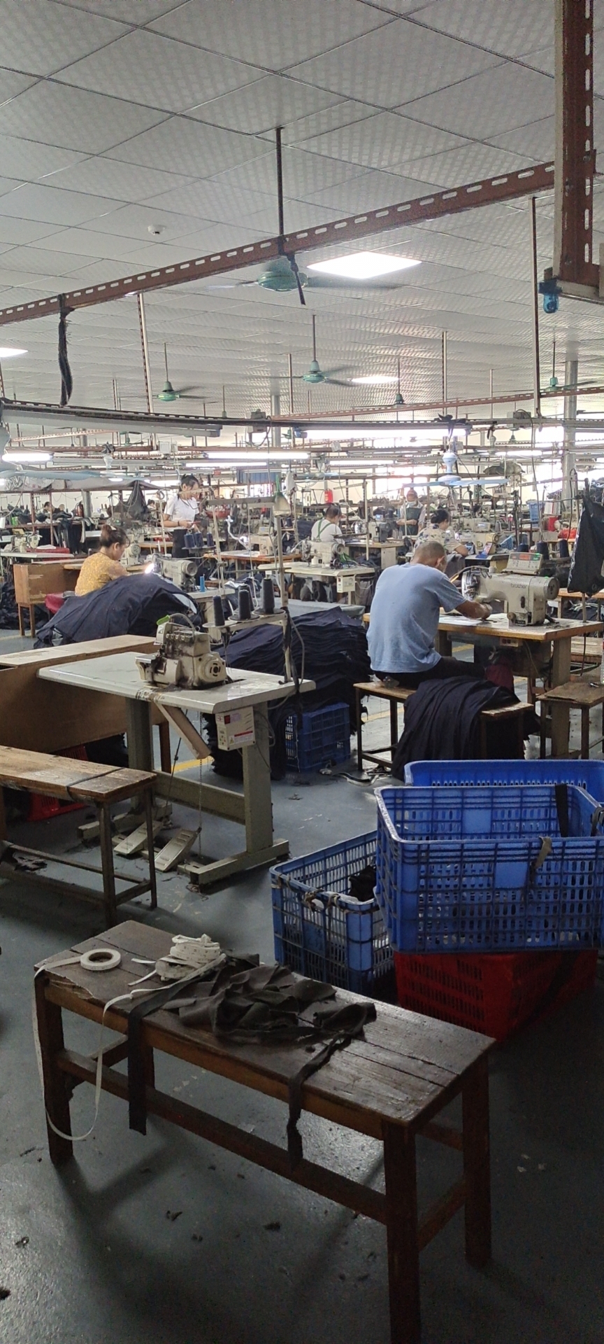 裤头车:2台,定扣机:2台,剪线机:3台,钉扣:2台,颗粒炉:2台,平眼:1台,平车:35台,电烫炉:3台,直眼:1台,电脑凤眼:1台,打边机:8台,双针车:6台,电剪:2台,烫台:3台,唛架机:1台,裁床:2台,五线:6台,四线:5台