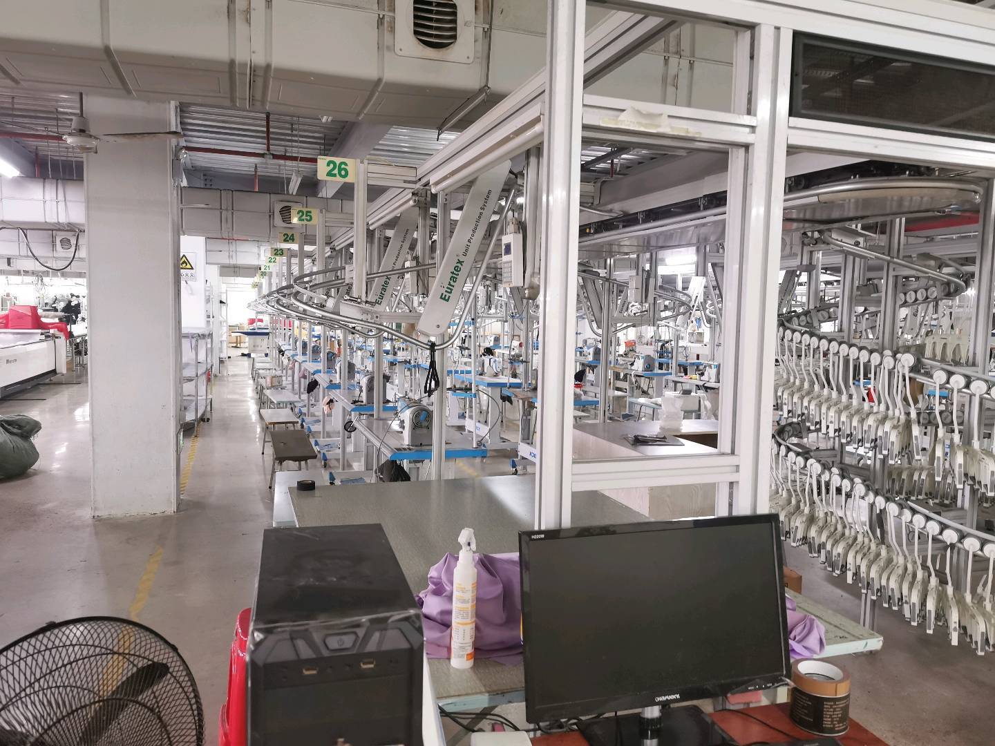 裤头车:3台,智能模板机:3台,自动拉布机:1台,电脑自动裁:1台,松布机:1台,定扣机:3台,挑脚机:2台,剪线机:2台,验布机:1台,断布机:1台,钉扣:2台,自动打扣机:1台,颗粒炉:3台,平眼:2台,吊机:1台,平车:150台,电烫炉:0台,直眼:2台,电脑凤眼:1台,打边机:7台,双针车:2台,电剪:4台,烫台:9台,冚车:2台,唛架机:1台,锅炉:3台,水空调:10台,裁床:3台,五线:4台,四线:4台