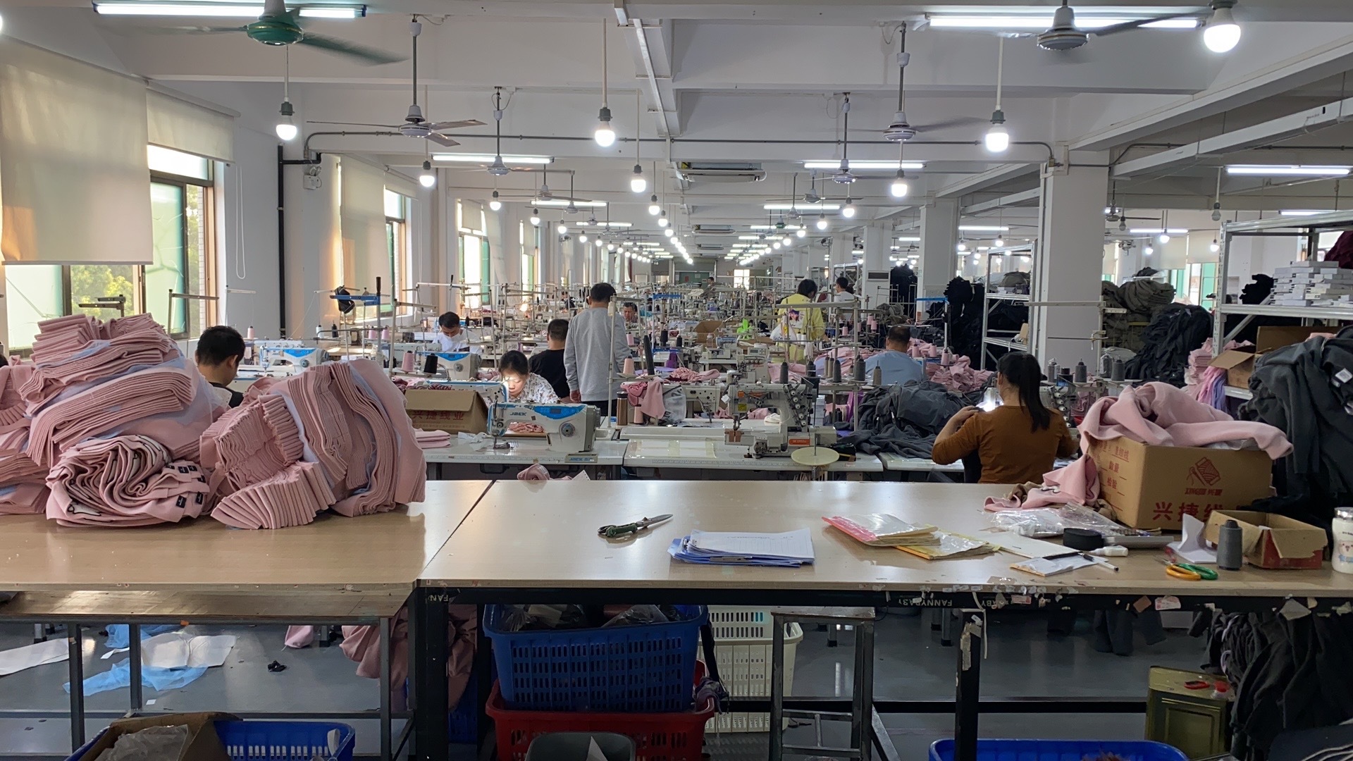 裤头车:5台,智能模板机:3台,自动拉布机:3台,电脑自动裁:1台,啤机:5台,松布机:1台,定扣机:1台,挑脚机:1台,剪线机:6台,验布机:2台,断布机:3台,钉扣:1台,自动打扣机:1台,颗粒炉:1台,平眼:1台,平车:40台,电烫炉:1台,针扣机:1台,直眼:1台,电脑凤眼:1台,双针车:6台,电剪:5台,烫台:10台,冚车:8台,唛架机:2台,锅炉:2台,水空调:4台,裁床:3台,五线:10台,四线:20台