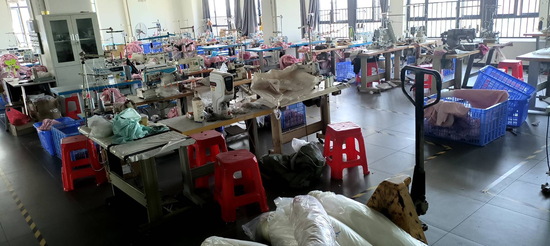 裤头车:1台,定扣机:2台,挑脚机:1台,钉扣:2台,自动打扣机:2台,平眼:1台,平车:45台,电烫炉:2台,直眼:1台,打边机:9台,双针车:2台,电剪:2台,烫台:6台,冚车:4台,锅炉:2台,裁床:1台,五线:3台,四线:7台