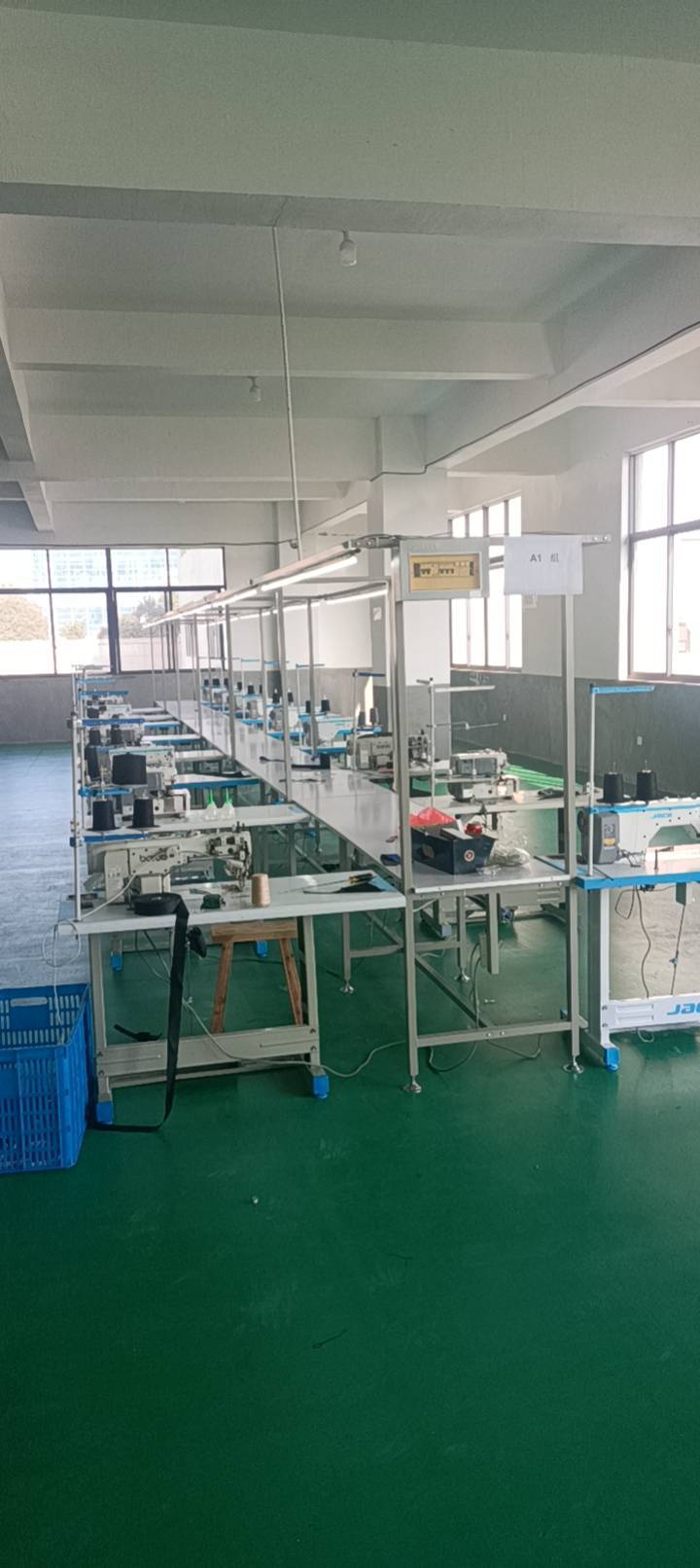 裤头车:3台,自动拉布机:2台,啤机:2台,定扣机:3台,剪线机:5台,断布机:1台,自动打扣机:3台,平眼:2台,平车:100台,针扣机:5台,直眼:2台,电脑凤眼:4台,打边机:12台,双针车:3台,烫台:6台,唛架机:4台,水空调:5台,五线:20台,四线:15台