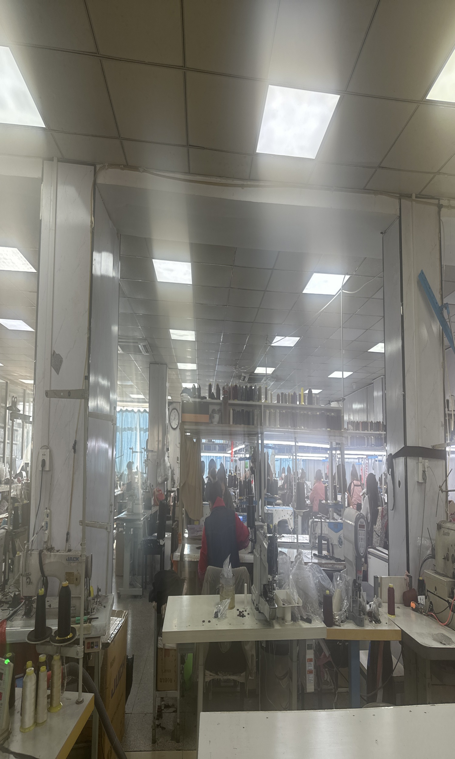 定扣机:1台,剪线机:1台,断布机:1台,钉扣:1台,颗粒炉:1台,平眼:1台,平车:20台,针扣机:1台,电脑凤眼:1台,双针车:2台,电剪:3台,烫台:5台,冚车:1台,锅炉:1台,五线:2台,四线:2台