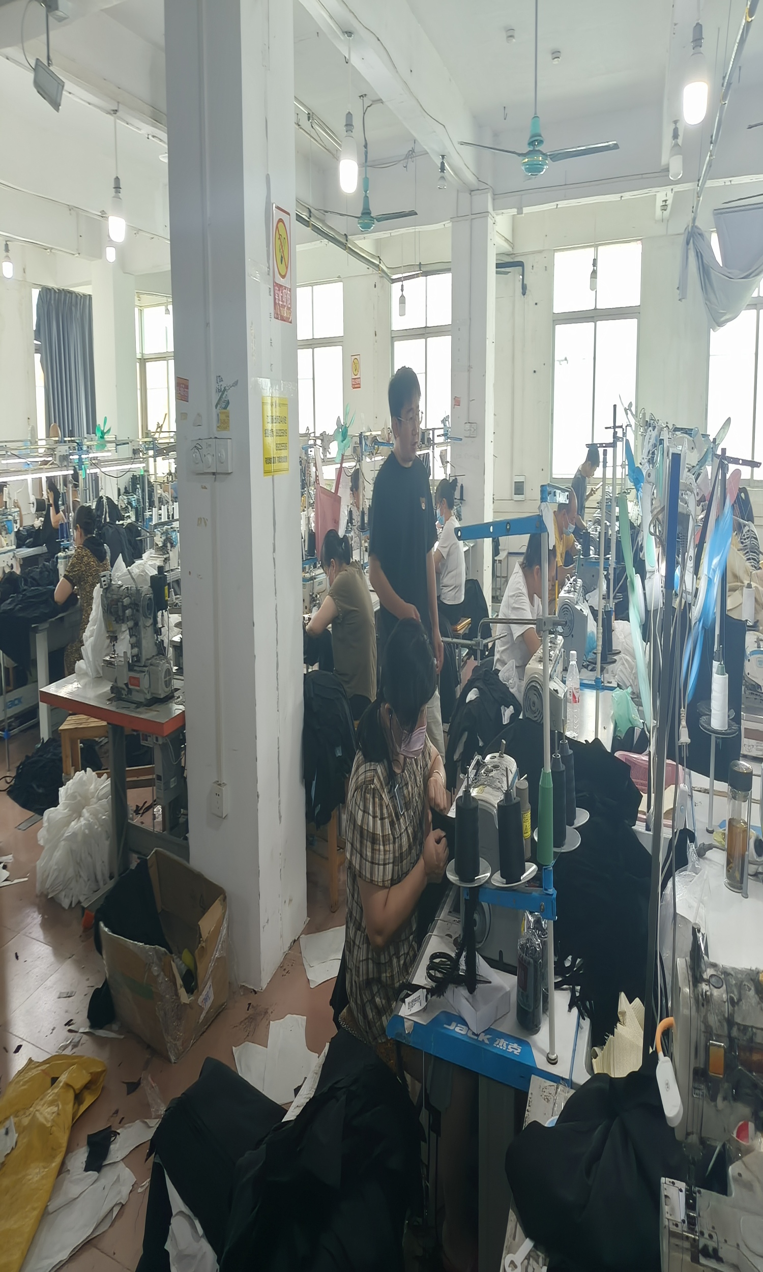 验布机:1台,电烫炉:2台,打边机:40台,双针车:40台,烫台:4台,冚车:5台,唛架机:1台,锅炉:1台,裁床:14台,五线:8台,四线:40台