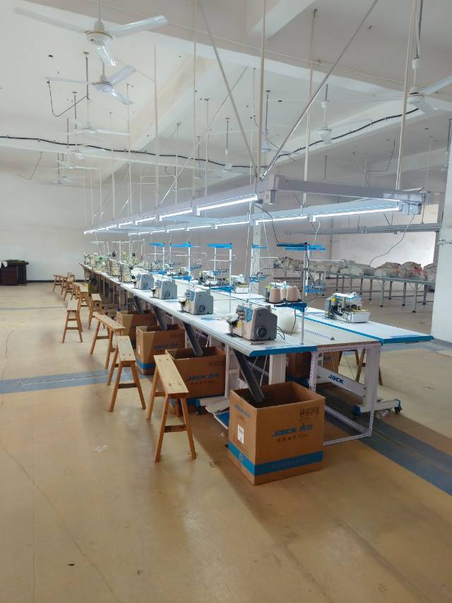 定扣机:1台,剪线机:1台,断布机:2台,钉扣:1台,平眼:1台,平车:20台,针扣机:1台,直眼:1台,双针车:6台,电剪:3台,烫台:2台,冚车:3台,唛架机:1台,裁床:1台,五线:6台,四线:20台