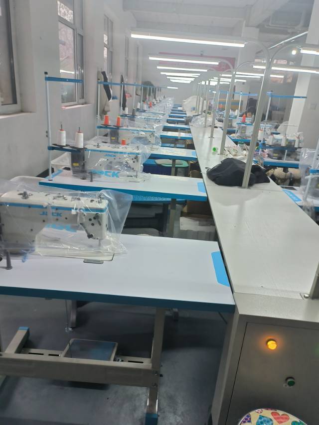 裤头车:1台,自动拉布机:1台,电脑自动裁:1台,定扣机:4台,断布机:2台,平眼:2台,平车:40台,针扣机:2台,直眼:1台,打边机:2台,双针车:4台,烫台:3台,五线:4台,四线:3台