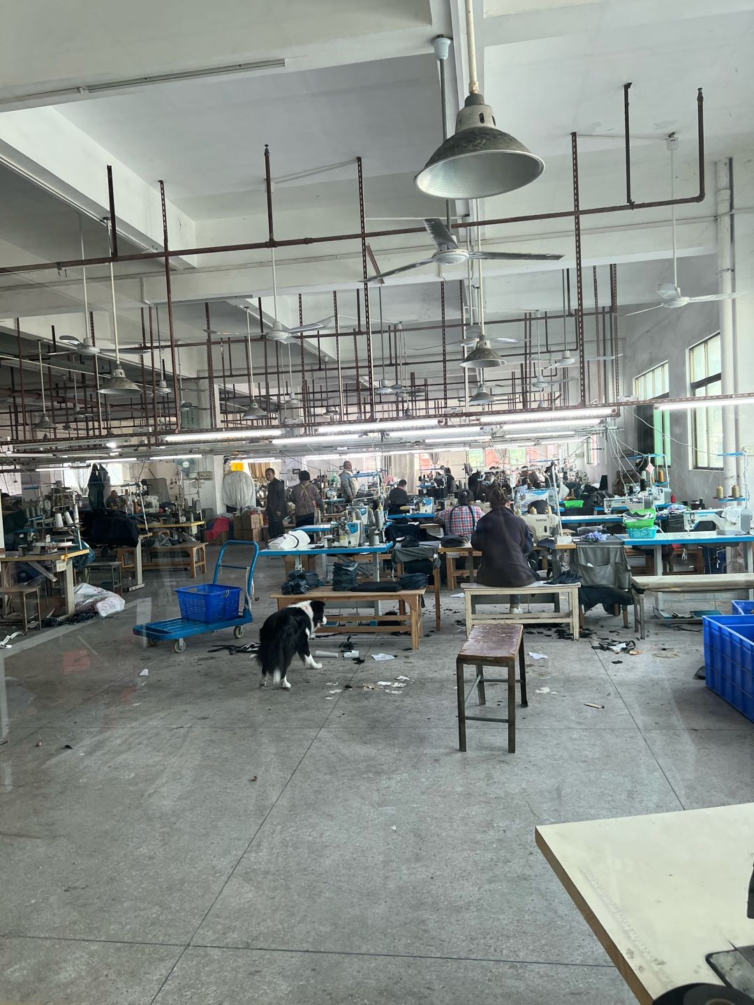 裤头车:3台,定扣机:3台,剪线机:4台,钉扣:4台,颗粒炉:1台,平眼:1台,平车:38台,直眼:1台,电脑凤眼:1台,打边机:12台,双针车:10台,电剪:3台,烫台:4台,唛架机:1台,锅炉:1台,裁床:2台,五线:8台