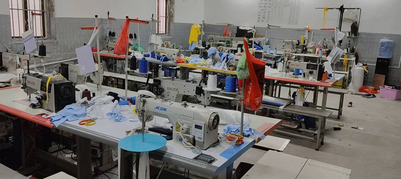 裤头车:1台,剪线机:3台,断布机:1台,电烫炉:1台,打边机:5台,双针车:1台,烫台:2台,冚车:2台,唛架机:1台,锅炉:1台,裁床:1台,四线:4台