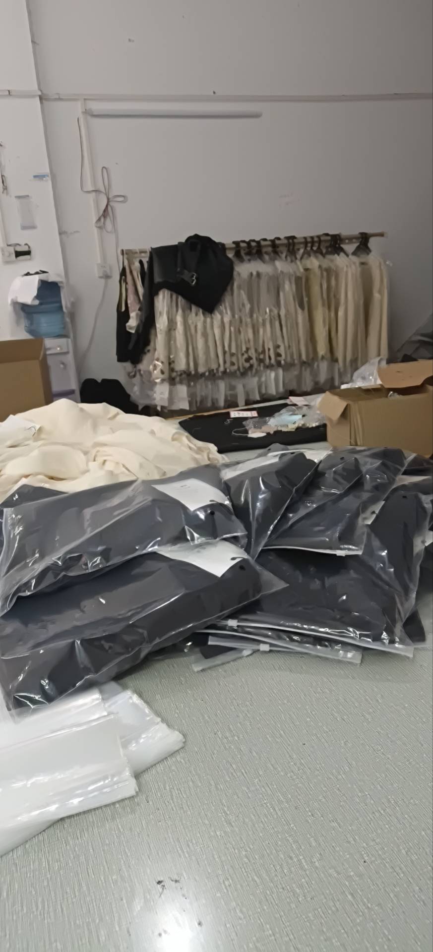 定扣机:2台,剪线机:1台,断布机:1台,平车:15台,针扣机:1台,电脑凤眼:1台,打边机:3台,双针车:1台,电剪:2台,烫台:3台,冚车:2台,唛架机:1台,锅炉:2台,裁床:1台,五线:2台,四线:4台