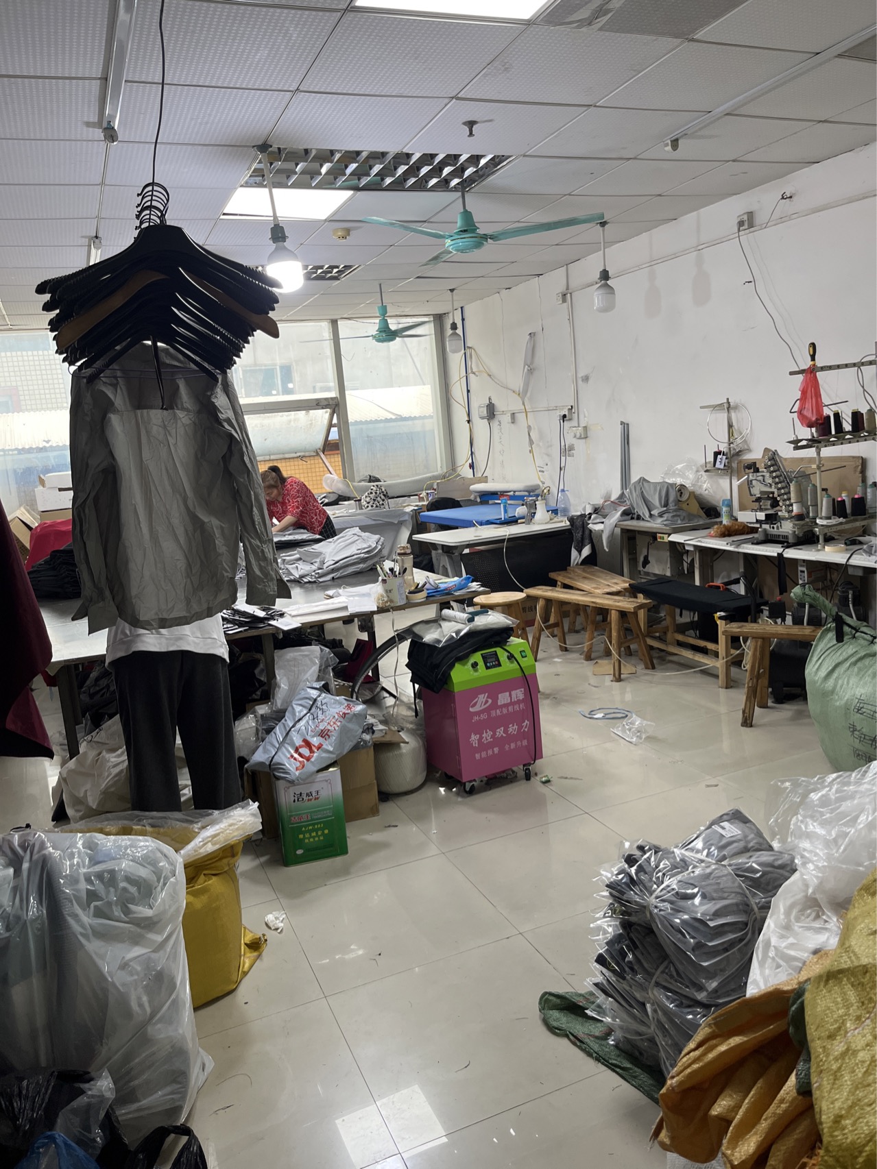 裤头车:1台,剪线机:1台,平眼:1台,平车:15台,双针车:1台,烫台:2台,唛架机:1台,五线:1台