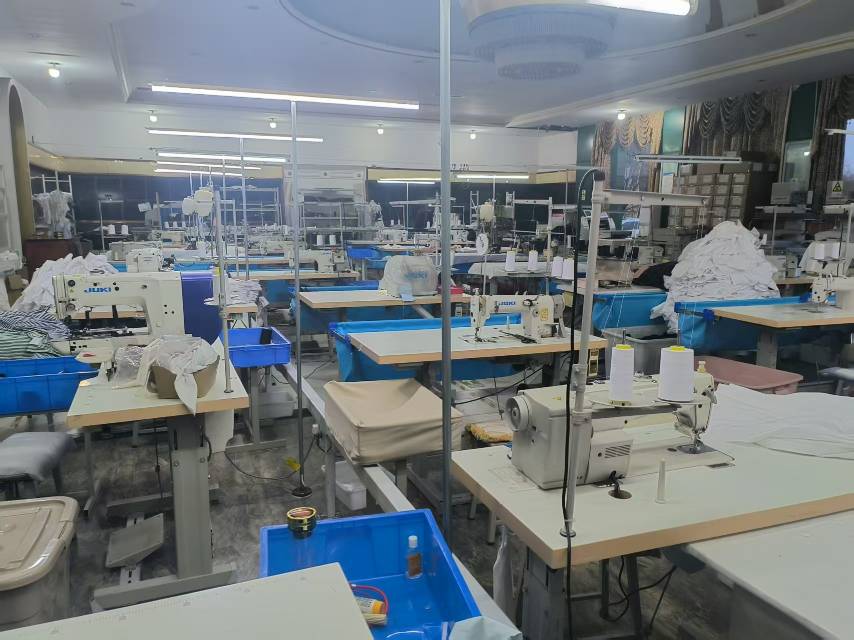 裤头车:5台,智能模板机:5台,自动拉布机:5台,电脑自动裁:5台,啤机:5台,松布机:5台,定扣机:5台,挑脚机:5台,剪线机:5台,验布机:5台,断布机:5台,自动打扣机:10台,颗粒炉:5台,平眼:10台,吊机:10台,平车:10台,电烫炉:10台,针扣机:10台,直眼:10台,电脑凤眼:10台,双针车:8台,电剪:5台,烫台:8台,冚车:6台,唛架机:5台,锅炉:5台,水空调:8台,裁床:8台,五线:8台,四线:8台