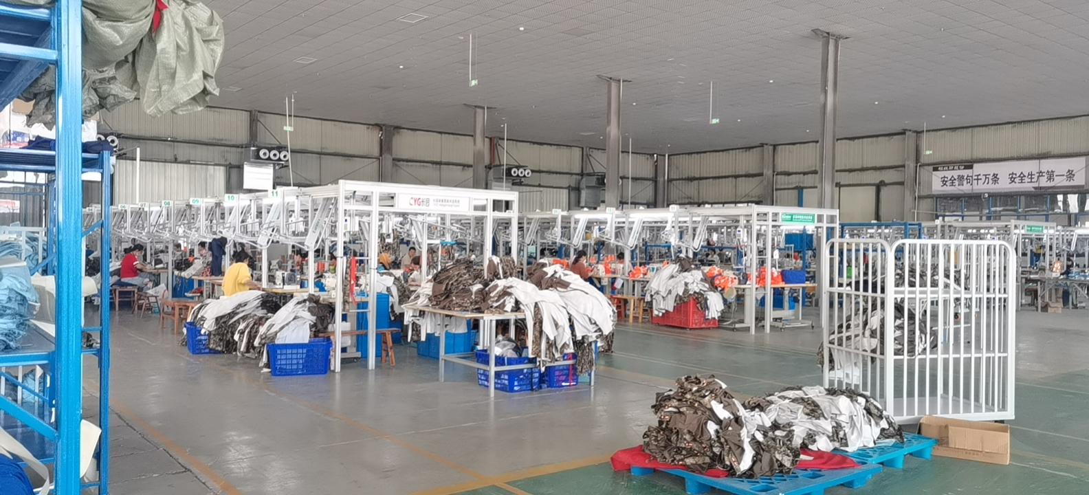 裤头车:1台,智能模板机:4台,自动拉布机:2台,电脑自动裁:2台,松布机:1台,定扣机:4台,挑脚机:1台,剪线机:2台,验布机:1台,断布机:2台,钉扣:4台,自动打扣机:3台,平眼:3台,平车:300台,电烫炉:6台,直眼:3台,打边机:8台,双针车:8台,电剪:3台,烫台:8台,冚车:3台,唛架机:2台,裁床:3台,五线:10台,四线:8台