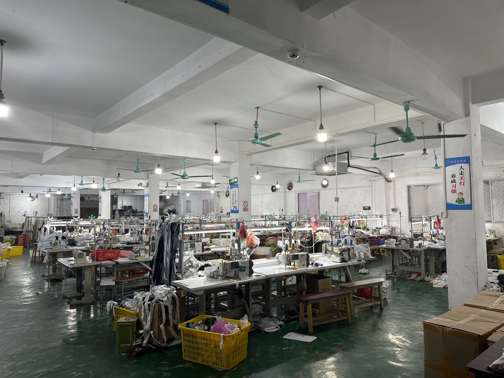 啤机:2台,松布机:1台,定扣机:2台,剪线机:2台,验布机:1台,断布机:2台,钉扣:2台,平眼:1台,平车:60台,电烫炉:8台,直眼:1台,电脑凤眼:1台,打边机:45台,双针车:3台,电剪:6台,烫台:8台,冚车:5台,唛架机:2台,锅炉:2台,水空调:8台,裁床:2台,五线:25台,四线:30台