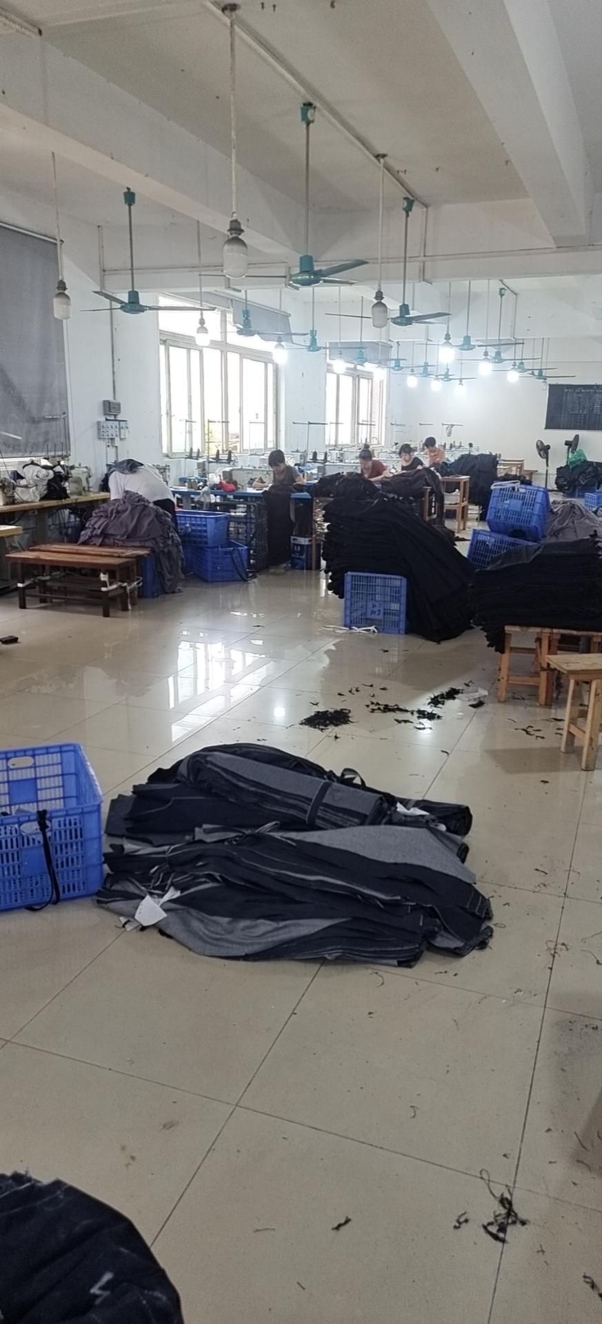裤头车:4台,定扣机:2台,剪线机:6台,验布机:1台,钉扣:5台,自动打扣机:3台,颗粒炉:3台,平车:60台,电烫炉:3台,直眼:2台,电脑凤眼:3台,打边机:6台,双针车:6台,电剪:3台,烫台:4台,唛架机:2台,锅炉:1台,裁床:2台,五线:6台,四线:2台