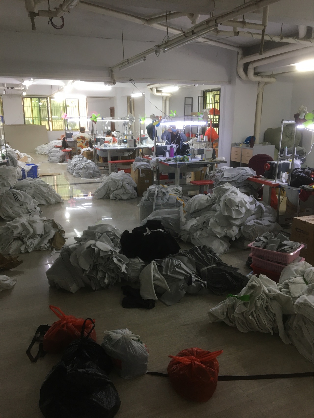 裤头车:1台,剪线机:2台,钉扣:1台,平车:16台,电烫炉:1台,打边机:10台,烫台:1台,冚车:2台,五线:3台,四线:8台