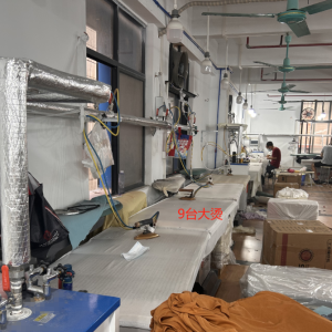 裤头车:1台,定扣机:5台,挑脚机:1台,剪线机:8台,验布机:1台,断布机:4台,钉扣:1台,自动打扣机:3台,颗粒炉:3台,平眼:4台,平车:80台,电烫炉:9台,直眼:4台,打边机:45台,双针车:8台,电剪:8台,烫台:9台,冚车:8台,唛架机:1台,水空调:7台,裁床:4台,五线:25台,四线:25台