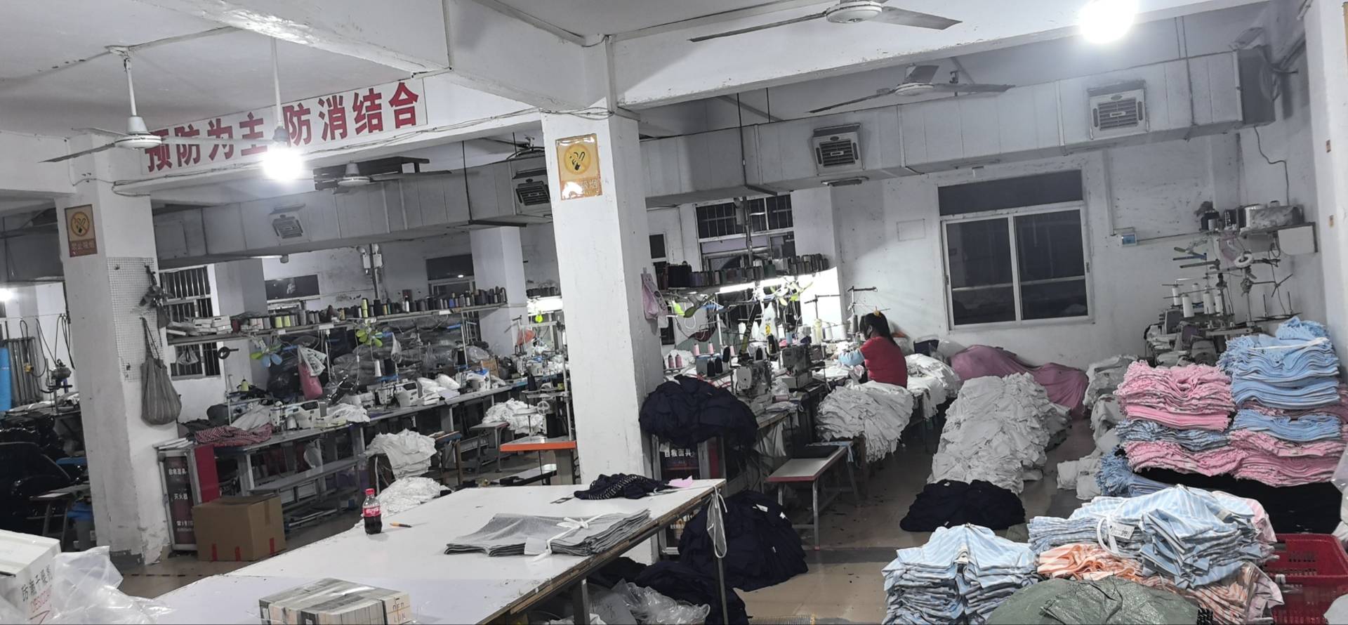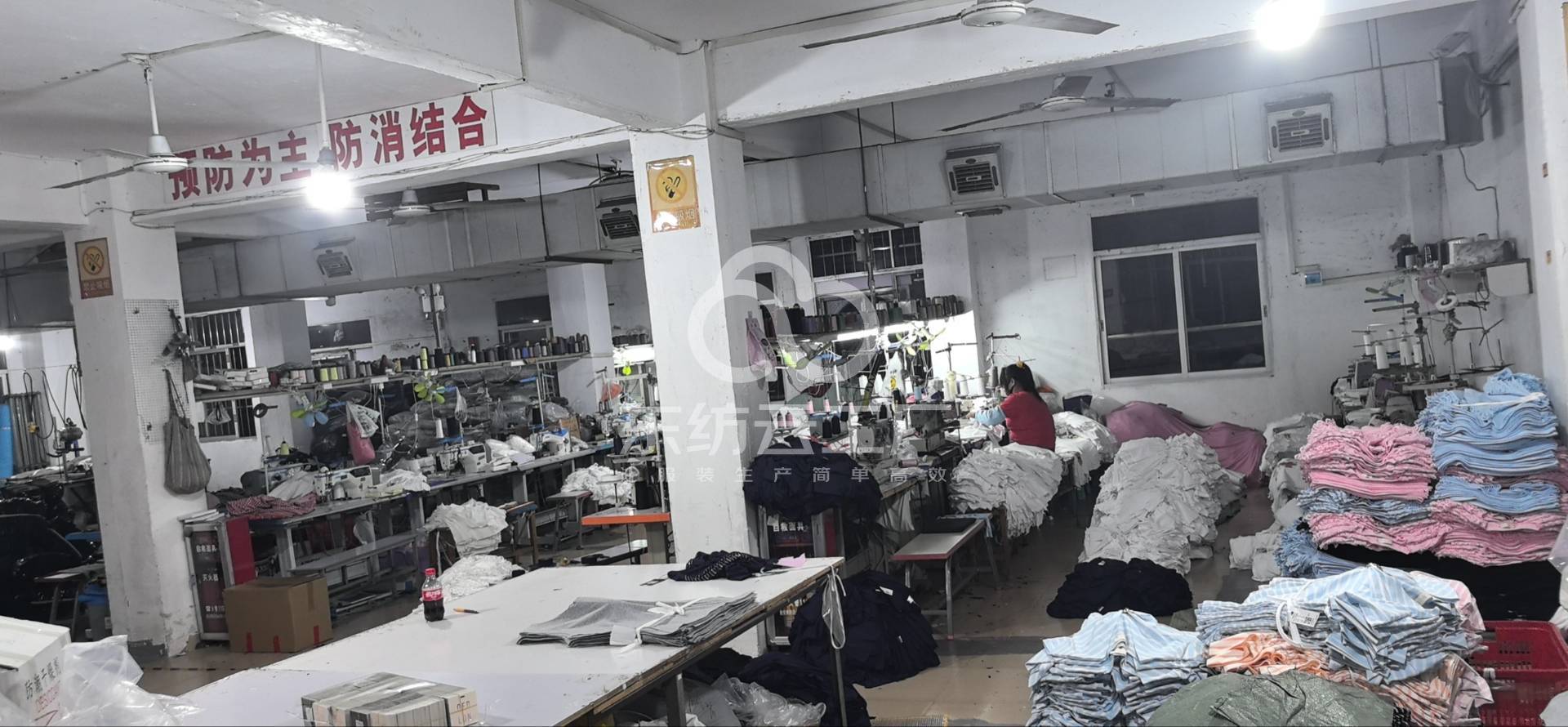 断布机:2台,吊机:1台,平车:8台,电烫炉:2台,打边机:12台,电剪:4台,烫台:2台,冚车:4台,唛架机:1台,锅炉:1台,水空调:1台,裁床:1台,四线:12台