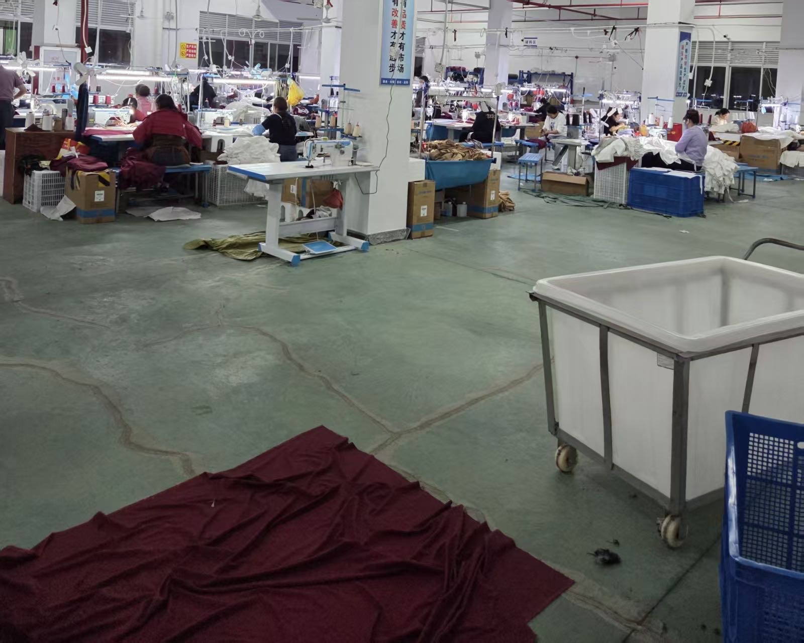 裤头车:40台,智能模板机:2台,自动拉布机:2台,电脑自动裁:2台,啤机:6台,松布机:2台,定扣机:5台,挑脚机:2台,剪线机:4台,验布机:1台,断布机:2台,钉扣:6台,自动打扣机:6台,颗粒炉:6台,吊机:3台,电烫炉:6台,直眼:3台,双针车:6台,电剪:1台,烫台:6台,冚车:2台,唛架机:2台,锅炉:6台,水空调:4台,裁床:2台,五线:6台,四线:6台