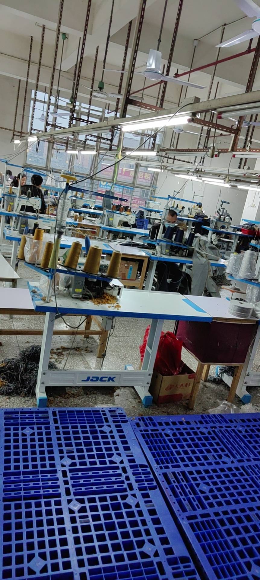 裤头车:2台,钉扣:3台,平车:15台,电烫炉:2台,直眼:1台,打边机:4台,双针车:4台,电剪:2台,裁床:2台,五线:4台