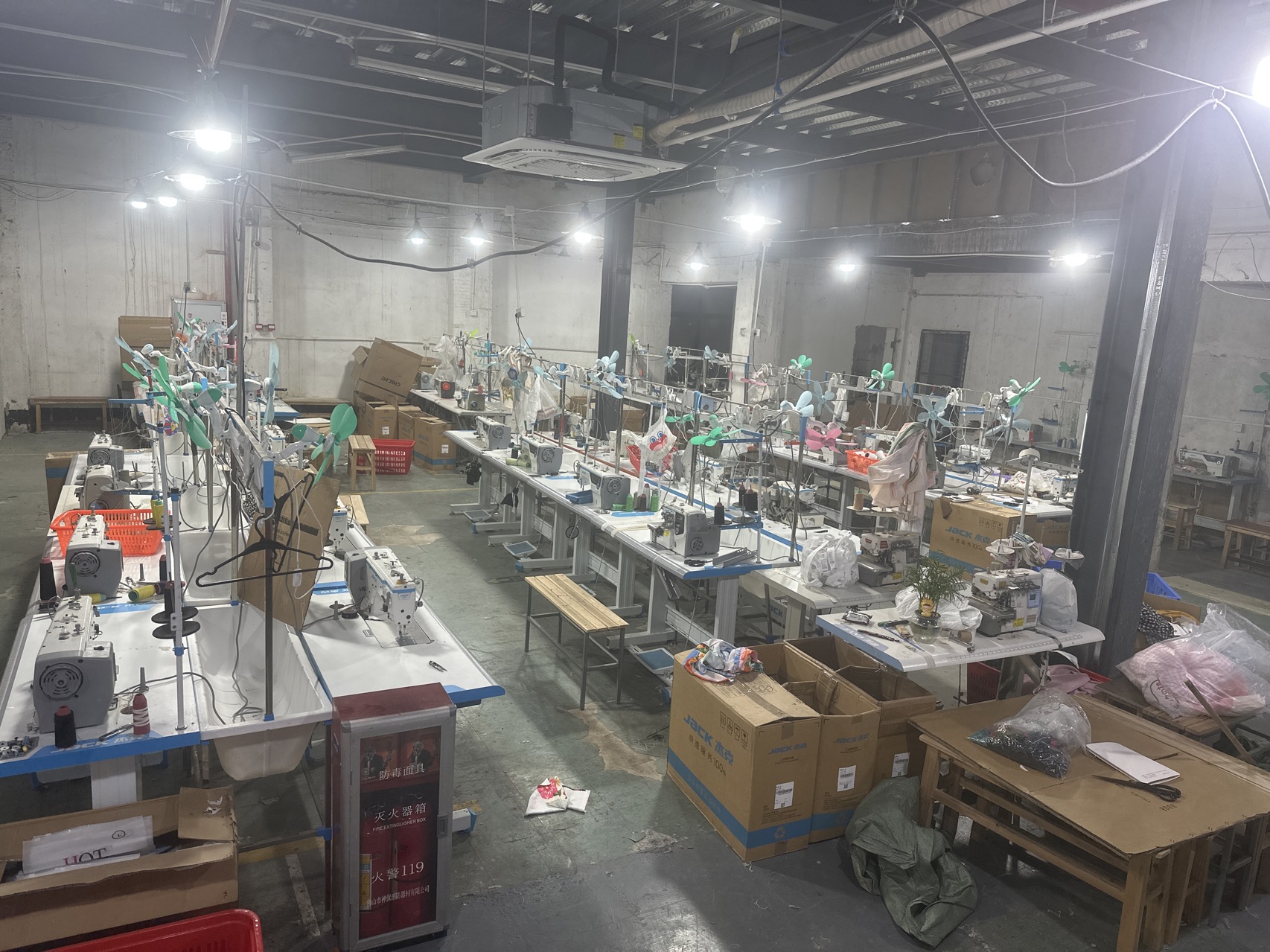 剪线机:3台,平车:45台,电烫炉:3台,打边机:15台