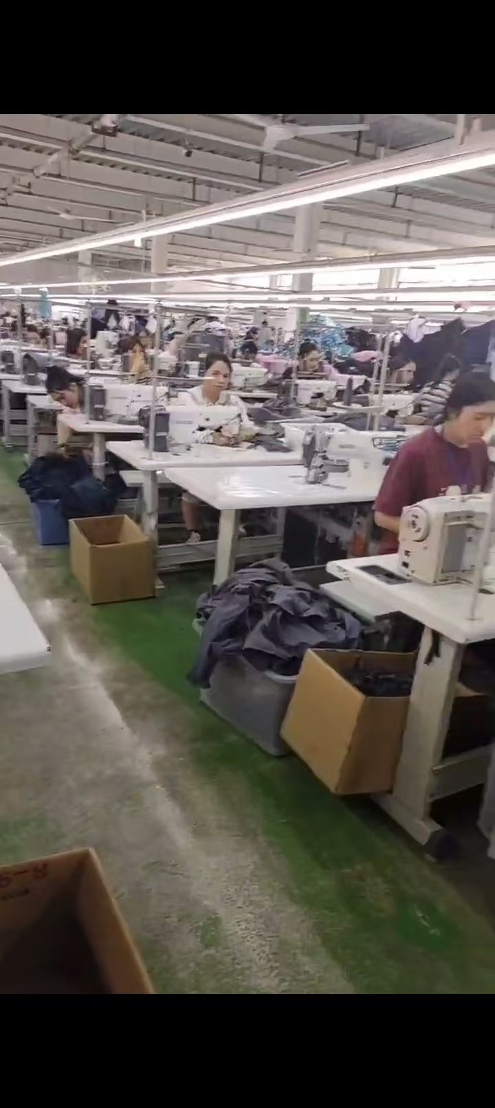 裤头车:2台,智能模板机:6台,自动拉布机:3台,电脑自动裁:3台,啤机:2台,松布机:6台,定扣机:8台,挑脚机:2台,剪线机:3台,验布机:2台,平眼:2台,平车:300台