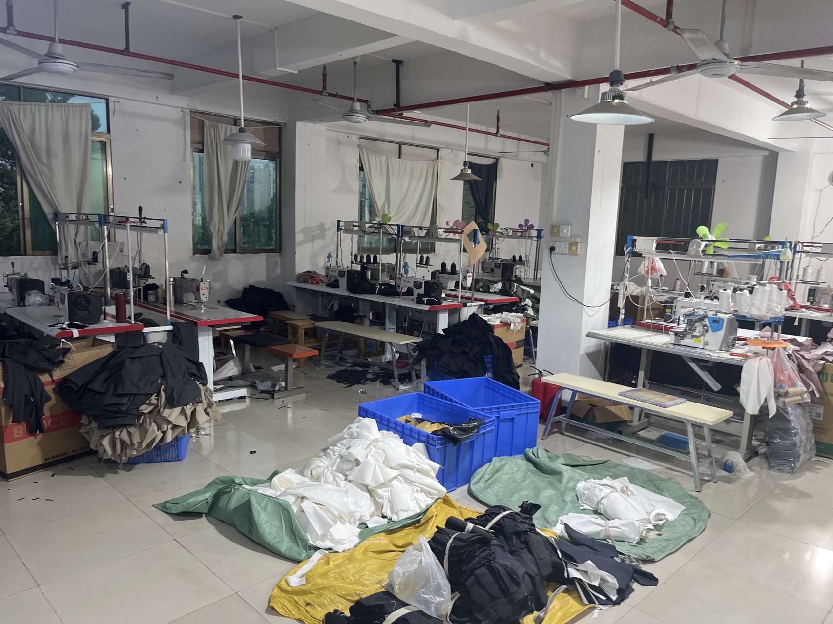 裤头车:1台,吊机:1台,平车:18台,电烫炉:2台,双针车:3台,烫台:2台,冚车:2台,锅炉:1台